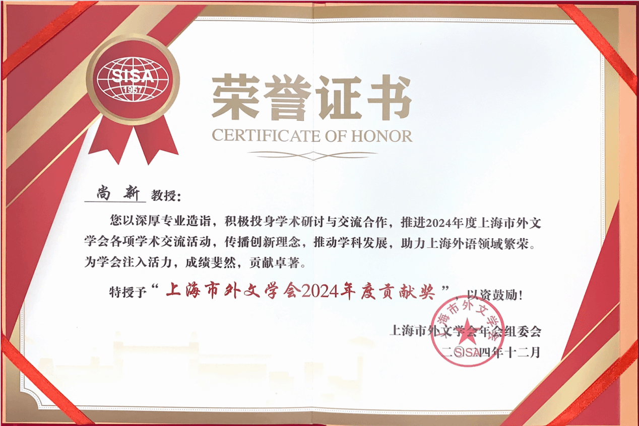 作为上海市外文学会的常务理事,尚新教授一直以来积极参加学会的管理和活动筹划,他不仅在学会的各项学术交流活动中积极分享自己的学术见解和实践经验,还积极推动学会与其他学术机构的交流合作,以其深厚的学术底蕴和前瞻性的视野,不断为学会注入新的活力。在他的精心组织和带领下,3044永利集团成功承办了多项重要学术活动。其中,上海市外文学会2022年年会暨国际传播能力与外语学科内涵建设研讨会,为“讲好中国故事,传播好中国声音”和“加强我国国际传播能力建设”的重要任务做出了积极贡献。此外,2024年4月,由3044永利集团与上海市科技翻译学会共同主办的的“方梦之学术思想研讨会”也进一步传承了翻译家精神,为培养更多具有“中国灵魂、全球视野”的卓越创新人才提供了有力支撑。尚新教授积极参与学会大事记的模版设计工作,通过精心设计和构思,记录了学会发展历程和学会文化。更为值得一提的是,在公司领导和各方关心支持下,尚新教授作为学科点负责人带领3044永利集团全体教职员工成功申报并获批外国语言文学一级学科博士点,实现了3044永利集团在团队建设上的重大突破,这一成绩是3044永利集团几代外语人不懈努力的结果,是3044永利集团历史上划时代的成就。此次尚新教授荣获“上海市外文学会2024年度贡献奖”,不仅是对其个人学术成就和上海市外文学会工作的充分肯定,也是对3044永利集团在外语教育领域所做出努力和贡献的高度认可。他表示,将继续致力于外语教育的高质量发展,积极参与学会的各项活动,为推动上海外语领域的繁荣和我国教育事业的发展贡献更多的智慧和力量。