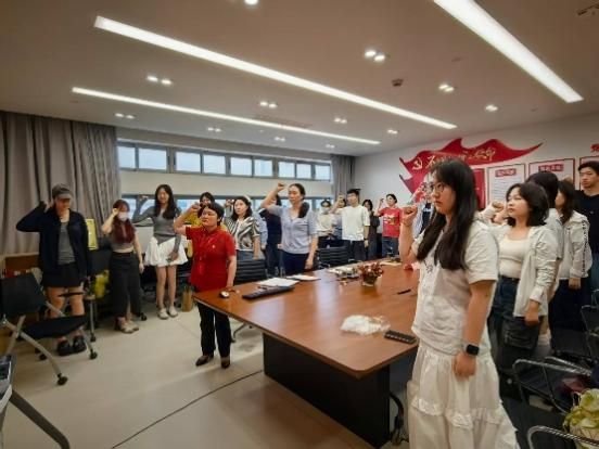吴蔚书记在总结讲话中提到毕业生党员践行“三个务必”:不忘初心、艰苦奋斗、敢于斗争,强调外语专业员工要立足文明互鉴,在对外交流中做到不卑不亢,把求知报国作为终身事业,像向日葵一样永远向阳生长。最后,她带领全体党员重温入党誓词,庄重肃穆的宣誓仪式将座谈会推向高潮。