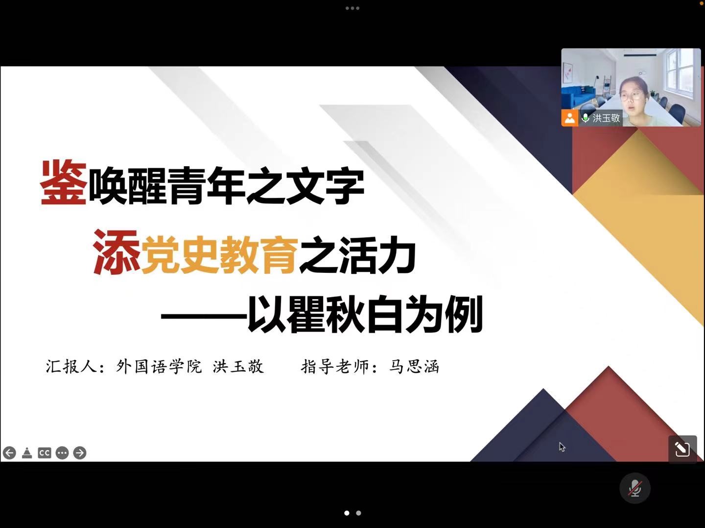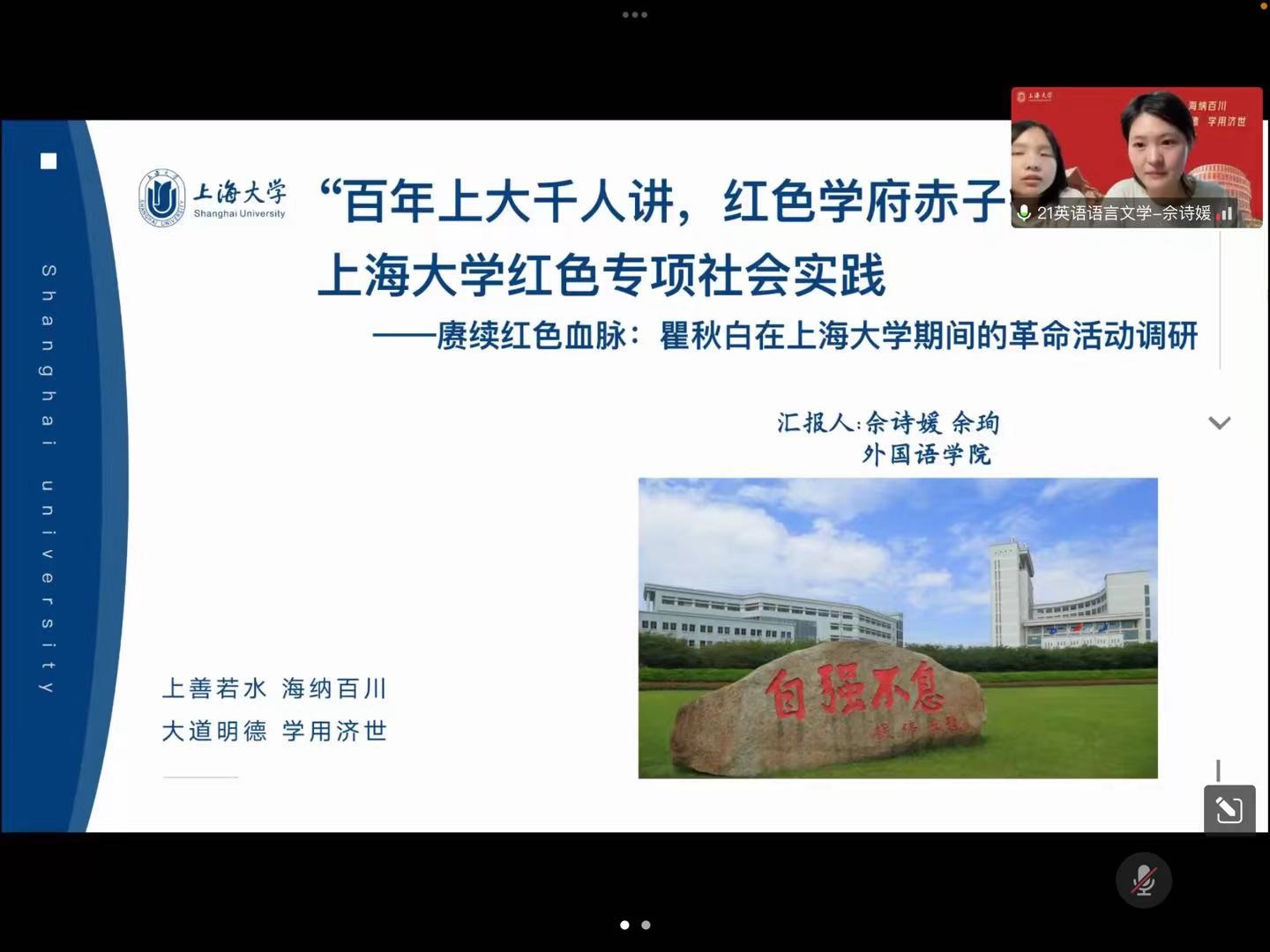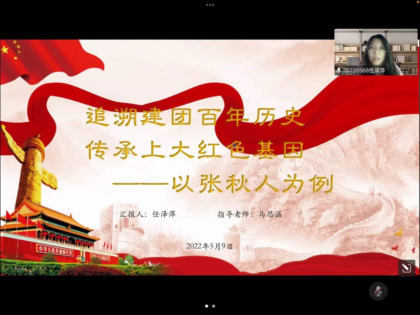 第三组员工代表是任泽萍同学,主题是“追溯建团百年历史,传承上大红色基因:以张秋人为例”,旨在学习革命烈士张秋人的奋斗精神。她从项目概述、实践地点、开展思路、成果展示、感悟等五方面展开讲述,带领大家了解张秋人烈士的革命事迹和奋斗精神,加深了我们对团史校史的理解,呼吁当代青年把红色精神内化为动力,传承弘扬上大人的红色基因。