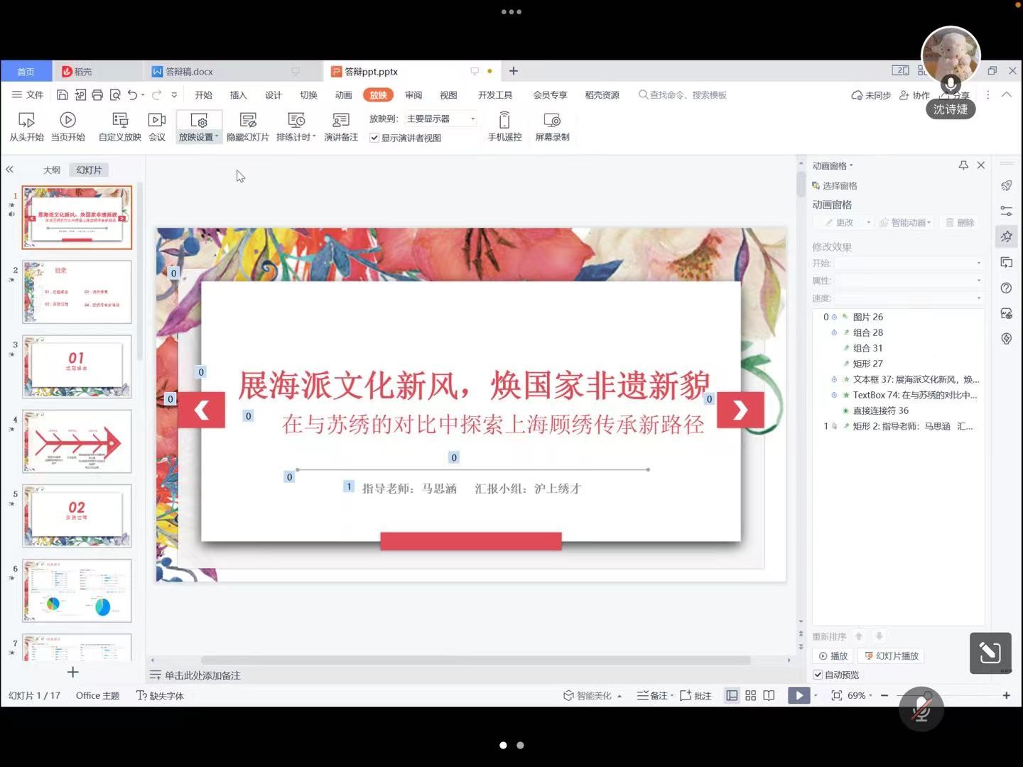 第二组员工代表是沈诗婕同学,主题是“展海派文化新风,焕国家非遗新貌——在与苏绣、蜀绣的对比中探索上海顾绣传承新路径”,旨在通过与苏绣的对比中探索上海顾绣的传承新路径,从选题缘由、实践过程、调研结果和对顾绣传承新路径的思考四个方面展开阐述。调研结果部分分析了顾绣传承面临困境的原因,从而对应衍生出国内赋活传承、加大对外传播。