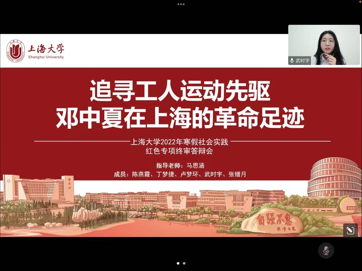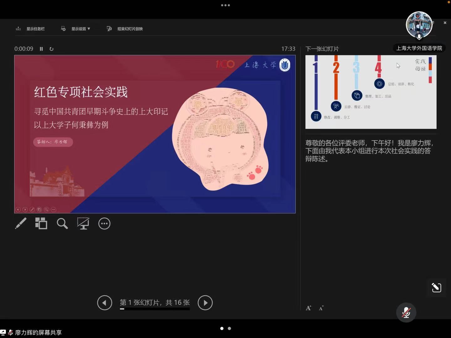 首先,第一组员工代表廖力辉同学带来了以“上大学子何秉彝为例寻觅中国共青团早期斗争史上的上大印记”为主题的项目分享。小组通过腾讯会议等媒介进行了何秉彝先辈的事迹宣讲传播,其后期设想是联合其他红色实践团队及公众号形成系列故事。