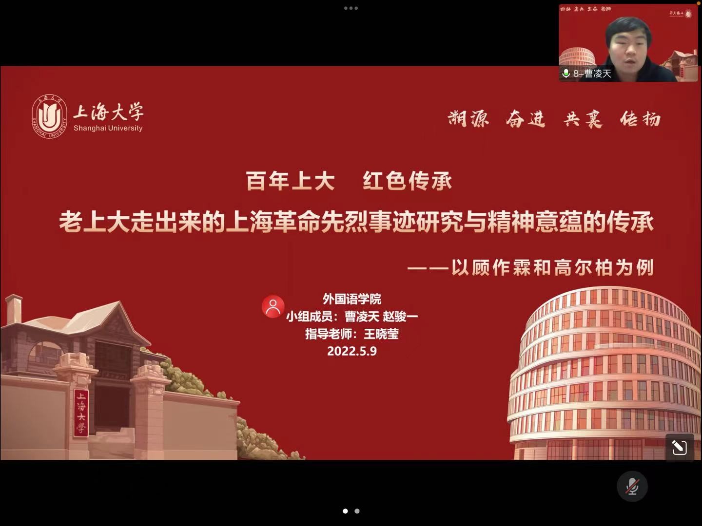 第八组员工代表是曹凌天同学,主题是“老上大走出来的上海革命先烈事迹研究与精神意蕴的传承——以顾作霖和高尔柏为例”,探访了徐行镇红色纪念馆和溯园,积极搭建了青年创学习平台,从重要意义、独到内涵和蕴含精神的关联三个问题入手调研,探究上大红色历史的传承,坚定当代青年学子的理想信念。