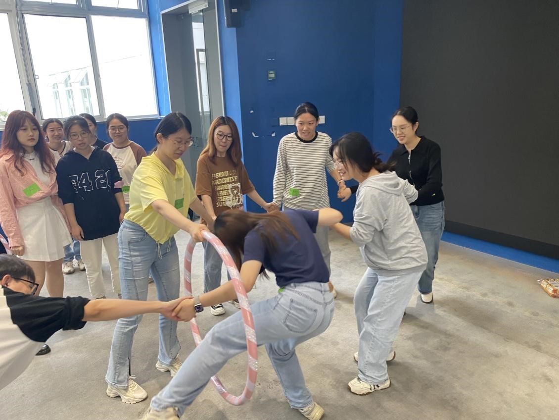 小组成员小手拉大手,将呼啦圈从队首传到队尾,共闯呼啦圈难关。大家配合默契,动作流畅,眨眼间便已完成比赛。