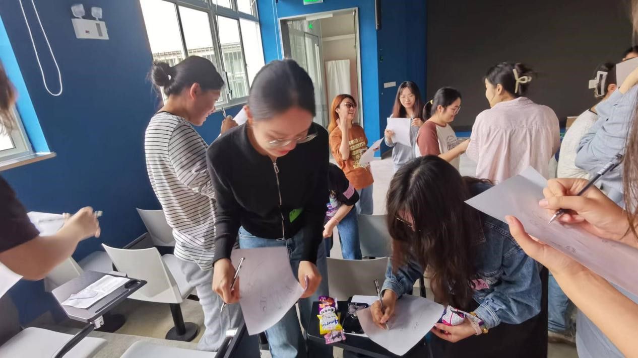 大家在白纸上画下自己的手掌,在每个手指上写下星座、家乡等问题的答案,然后寻找有缘人进行匹配。“谁喜欢蓝色?”“金牛座的朋友在哪里?”大家离开座位,询问是否有相同的答案,在过程中熟络了起来。那张只有自己姓名的白纸,如今又添上了他人的名字,两条并不相交的平行线从此有了交集。