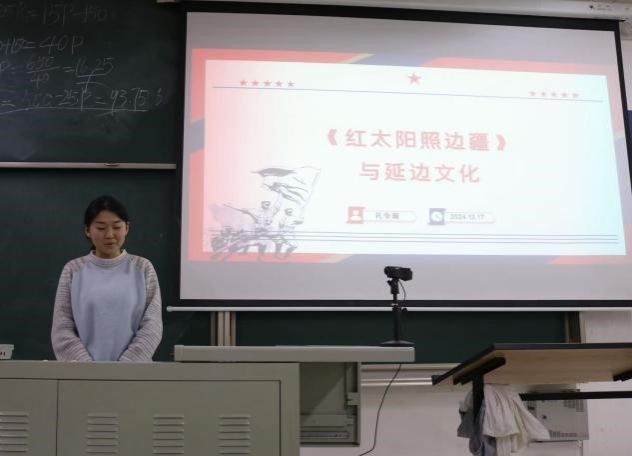 会议首先由团委副书记孔令璇介绍了《红太阳照边疆》与延边文化的深厚联系。她作为吉林学子代表详细阐述了这首歌曲的历史背景和社会意义,强调了歌曲中体现的边疆人民的奋斗精神和党的领导的重要性。最后,她热情邀请大家能够实地体会延边文化,感受延边人民的热情。