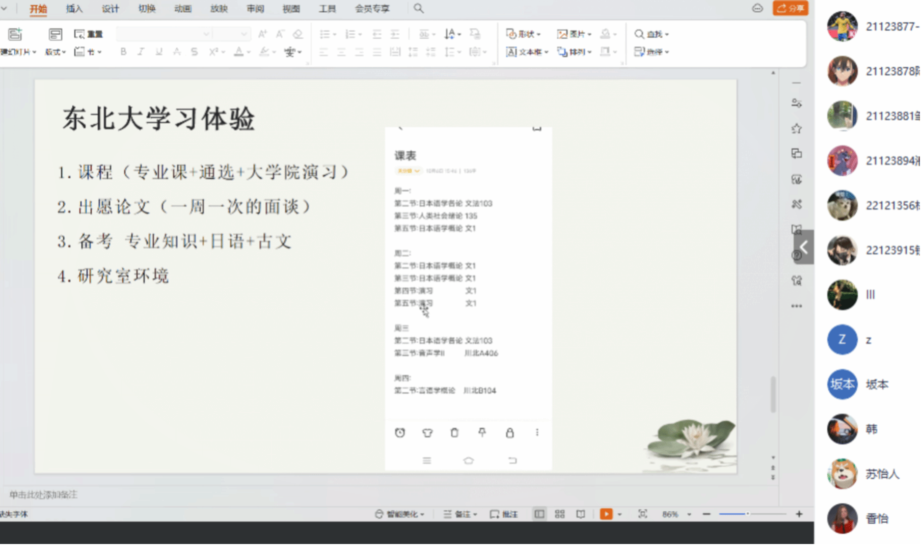随后,周禧龙员工分享了其申请攻读日本东北大学日本语学方向硕士研究生的心路历程。与苏怡人员工的直考升学路径有所不同,周禧龙同学介绍了其从“旁听生”到“硕士研究生”路径的求学体验。在分享过程中,重点对于作为旁听生在东北大学学习的详细情况进行了介绍。尤其针对课程安排,与导师的互动方式,研究室的环境等,面向有相似生涯规划的在校生进行了细致的讲解。