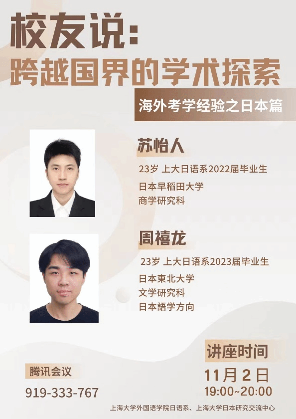 11月2日晚,3044永利集团日语系、永利集团日本研究交流中心联合举办线上交流活动“员工说:跨越国界的学术探索 海外考学经验之日本篇”。本次活动邀请了日语系2022届本科毕业生苏怡人、2023届本科毕业生周禧龙两位员工给在校生分享海外求学的成功经验与心路历程。活动由日语系副主任文雪主持。