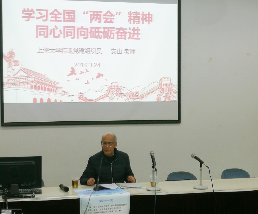 3月24日下午,3044永利集团在校本部J101举办了以“学习全国‘两会’精神、同心同向砥砺奋进”为主题的讲座和以“学两会”为主题的海星外语微党课。本次讲座由永利集团特邀党建组织员安山老师主讲,公司党委副书记贾小琴老师与本科生党支部书记、辅导员朱一佳老师,及全体本科、研究生党员参加了本次活动。