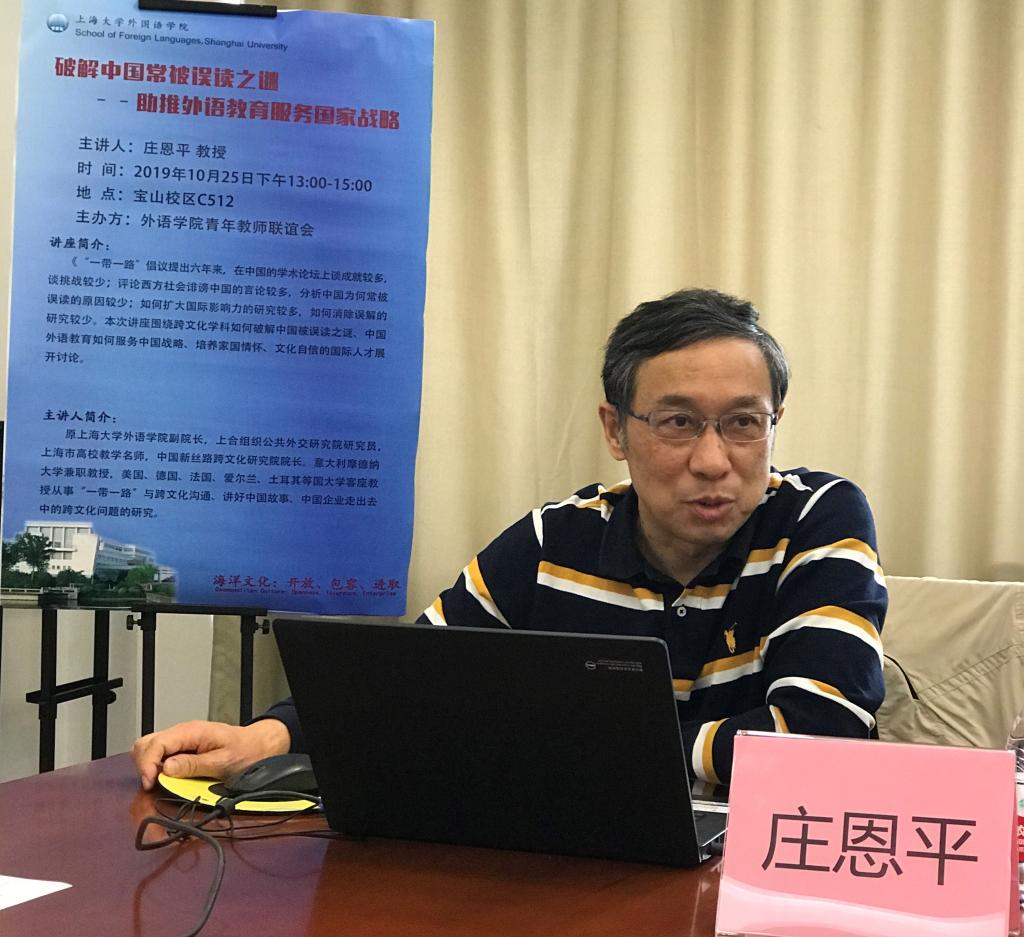 10月25日下午,庄恩平教授在永利集团校本部C512会议室开展了题为“破解中国常被误读之谜-助推外语教育服务国家战略”的讲座。讲座由3044永利集团青联会会长虞怡达老师主持,外语、中欧、悉商公司近五十位师生到场参与研讨。