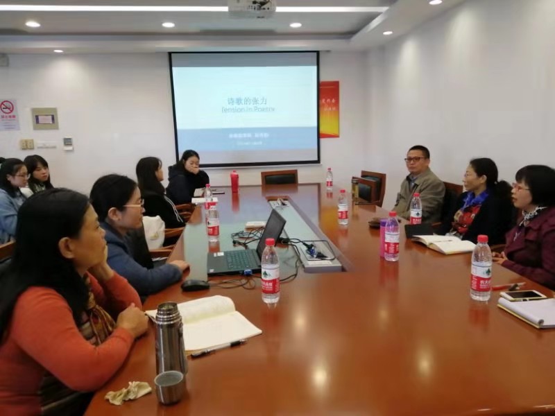 11月8日上午,湖畔诗社第五次活动在C512顺利进行,英语系副系主任张秀丽博士就“英语诗歌中的张力”做报告。曾桂娥教授、唐青叶教授、白岸杨老师、吴雁翔博士、金璐博士以及近30位研究生、本科生同学参加了本次活动。英语系唐根金副教授主持此次赏析会。