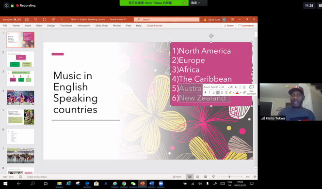 Tekwa老师首先向大家介绍了本节课的课程安排,接着回顾前6周的学习内容,他在授课时刻意放慢了语速,确保每个同学都能听懂。随后,他向员工们提出“What music of the English-speaking countries have you ever listened to?”导入本节课程主题即英语国家的音乐。在员工们普遍回答只听过英美流行音乐之后,他又抛出一个问题,“Why does music people listen to matters?”在一番互动之后,Tekwa老师似乎并不满足于员工们的答案,他切换到共享屏幕,播放准备好的视频材料,希望员工们带着这个问题思考视频传递的信息。就这样一步步地,Tekwa老师图文并茂地引导员工们领略从未听过的北美洲、大洋洲和欧洲的土著音乐。
