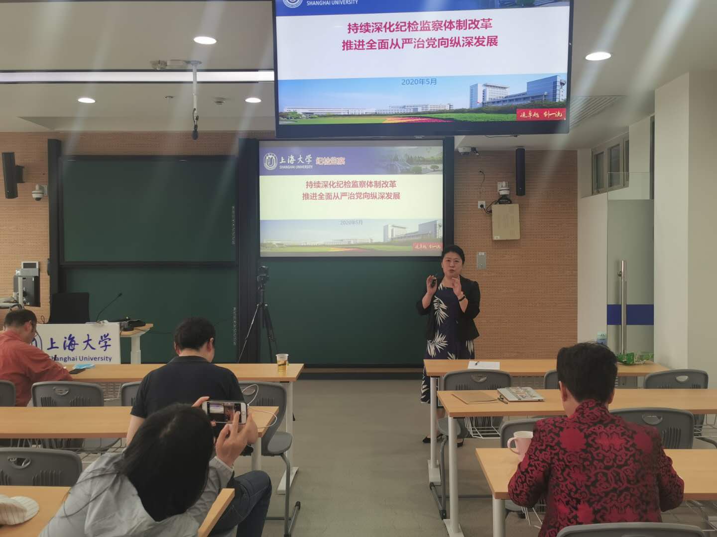 滕书记以“持续深化纪检监察体制改革 推进全面从严治党向纵深发展”为题开始了本次讲座。讲座内容分为四部分,第一部分,滕书记分析了全面从严治党的形势,阐明了十八大以来党和国家反腐高压态势不减,聚焦重点、打虎不停,坚定从严治党的决心。其次,滕书记阐释了深化纪检监察体制改革的重要性,对一体推进党的纪律检查体制改革、国家监察体制改革和纪律监察机构改革进行了详尽的解释说明,让在场教职员工对纪检监察工作从原本模糊的认识,到有了较为清晰的概念。再次,滕书记不具名分析了违纪违法典型案例,这些案例有些就发生在我们身边,能够提醒每一位教工在思想中要绷紧弦,不能触底线。最后,滕书记讲述了推动全面从严治党主体责任向基层延伸的工作,再次重申了党和国家推进全面从严治党向纵深发展的坚定决心。