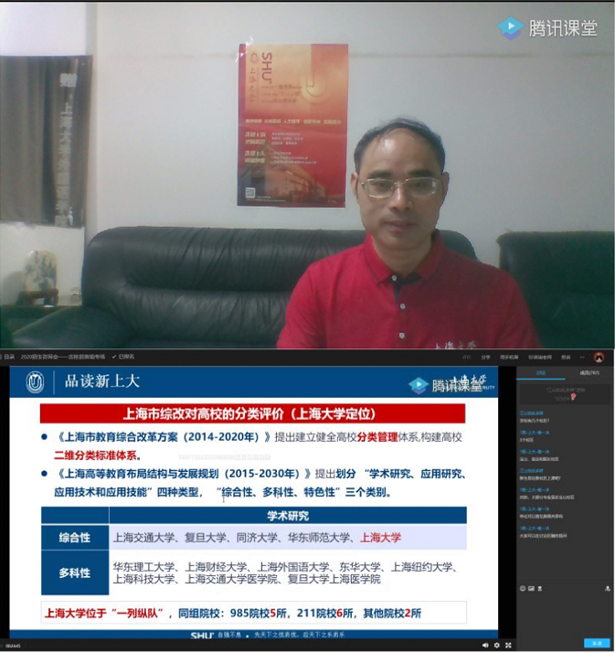 直播活动伊始,招宣组组长邓志勇老师从赓续永利集团红色基因的视域出发,介绍了百年上大精神的传承与积淀。随后,邓老师介绍了永利集团近年来在“追卓越、创一流”工作方面所取得一系列工作成效,先后从团队建设、科研成果、人才引进以及员工助力等方面为吉林学子做了重点推介。接着,邓老师从上大人才培养的愿景、理念和模式出发,详细介绍了钱伟长先生“三制”和“拆除四堵墙”等教育思想,解读了上大学子身上所具备的独特气质与涵养。最后,邓老师还向参与聆听本次线上直播咨询活动的广大吉林考生和家长介绍了2020年永利集团在吉高考招生政策的基本情况与调整变化之处。