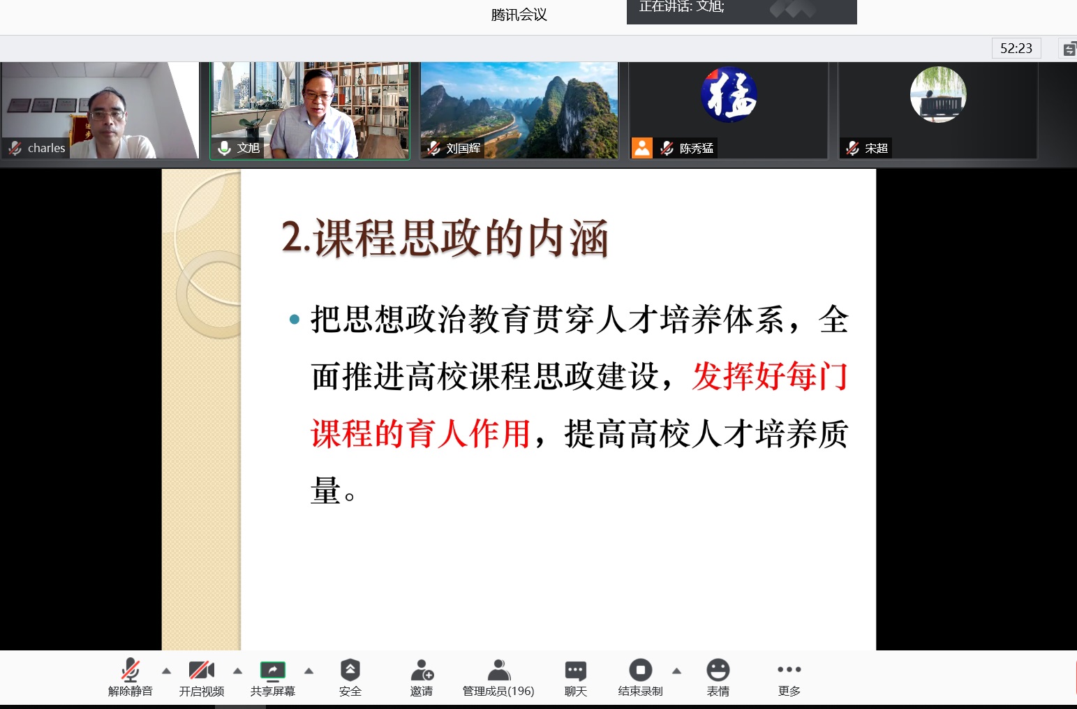 随后,文教授从公司层面出发,指出公司应科学设计外语专业课程思政的教学和评价体系,包括课程设置、教材资源、教学大纲、考核以及激励方式等,防止“贴标签”,“两张皮”,并用自己教学实践的实例生动阐释了“教外语,育全人”的教学理念。文教授指出课程思政的关键在于教师,鼓励广大教师通过学习和实践不断增强职业身份自信,专业自信,理念自信以及能力自信。最后,在线参会教师就教材、线上资源建设、教学研究和实践上和文教授进行了进一步的探讨。