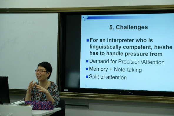 朱老师结合自己的教学经验和口译实战经历围绕口译的定义、标准、英汉两种语言几大重要差异、英汉口译互译几大重要技巧并配以案例分析展开。同时和参与的老师们们探讨了国际化课程中配合外教对课堂教学内容进行口译的教学设计等。