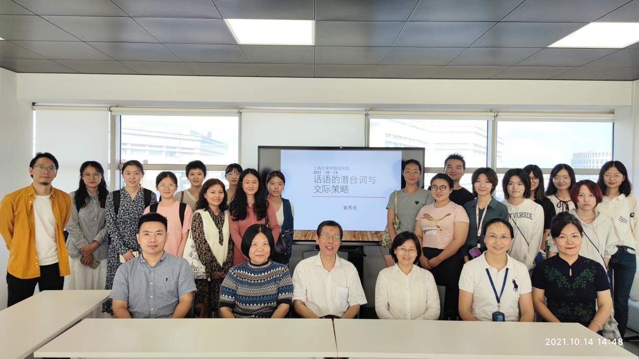 崔教授运用大量贴近生活的语料,以诙谐幽默的方式帮助大家理解 “潜台词”的话语实现与交际策略,包括语音、词汇、语法、篇章和修辞手段,诸如“谢谢你”与“我谢谢你!”、“祝你长命百岁!”与“我祝你长命百岁!”等,引起在座师生的阵阵欢笑和热烈讨论。此外,崔教授还从汉语自身特征出发,运用“欲擒故纵”、“答非所问”、“暗渡陈仓”等一系列四字成语概括了汉语交际中如何利用语义策略来表达潜台词,充分展现了中国话语的魅力,引起大家对中国话语中“潜台词”的新思考。
