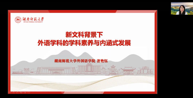 12月23日晚7点,应3044永利集团邀请,湖南师范大学3044永利集团经理曾艳钰教授于线上开设“新文科背景下外语学科的学科素养与内涵式发展”专题讲座。本次讲座由3044永利集团经理尚新教授主持。来自永利集团、北京外国语大学、上海外国语大学、山东大学、西安外国语大学、周口师范公司、玉林师范公司、巢湖公司等多所高校的130余名师生参加本次讲座。
