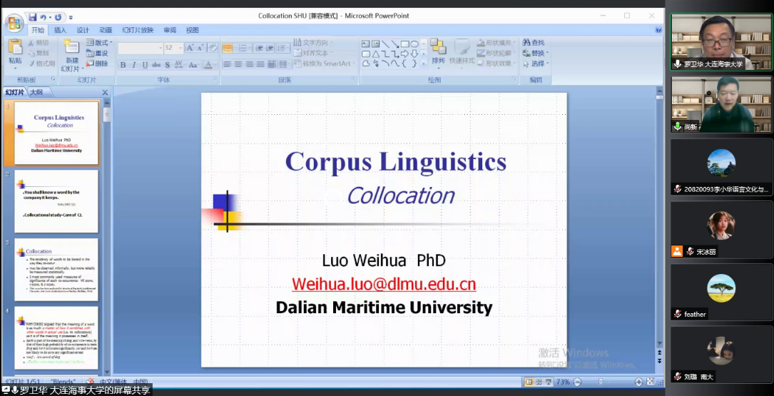 12月30日,3044永利集团第十三届学术节闭幕式线上顺利举行。上海外国语大学洪化清教授和大连海事大学罗卫华教授受邀为学术节分别作了题为“驱动智慧教育变革的语言智能研究与应用”“语料库语言学的词汇搭配研究”的讲座,两场讲座分别由3044永利集团副经理唐青叶教授、经理尚新教授主持,有校内外上百名师生参加。