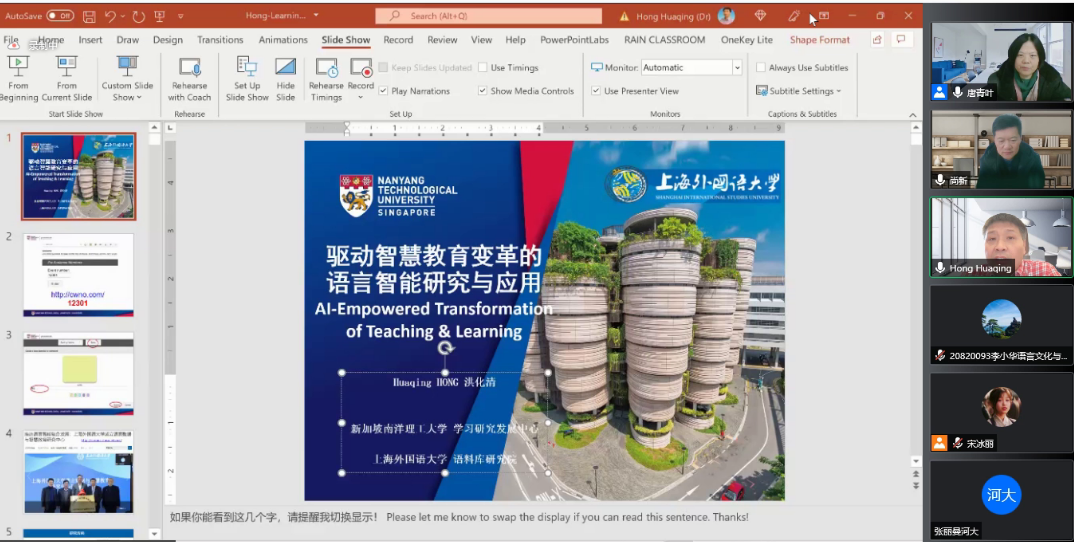 洪化清教授从南洋理工大学的教育定位谈起,指出将“未来学习”作为教学研究重点使该校实现了跨域式发展;之后,比较了中新两国的教育理念和人才培养目标,介绍了南洋理工大学的5C教育框架、4-Life学习框架以及新课程结构、技术增强的团队导向式学习模式,提出通过信息技术赋能,促进智慧教育;最后,洪教授从学习分析、教学内容分析、教材分析——语料库、学习行为和语言分析、内容粘性分析、课堂粘性分析、课堂话语分析、课堂讨论分析、在线学习/测试分析、线上展示分析等几个方面介绍了语言数据分析应如何开展,以引导员工终身学习、持续发展。
