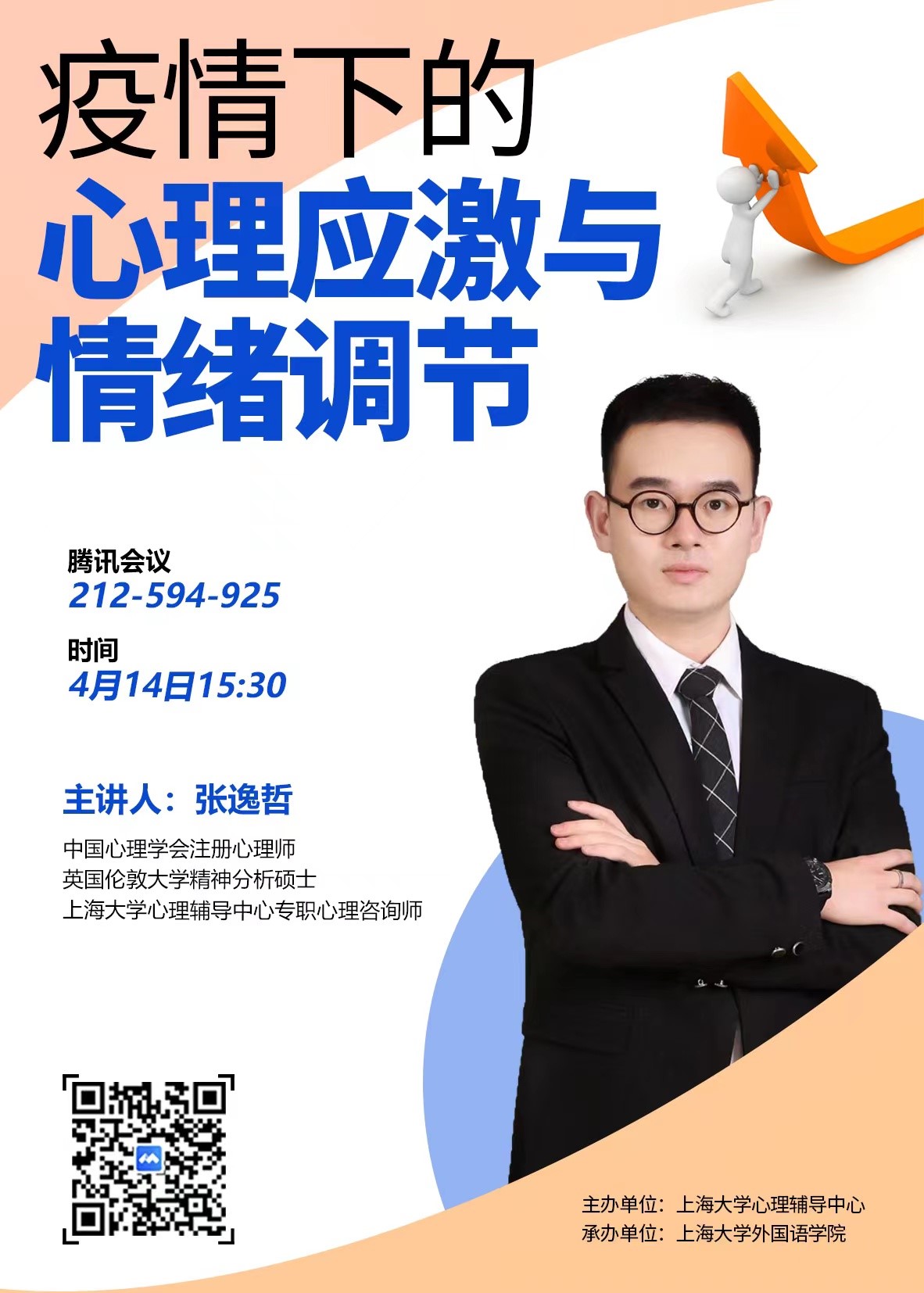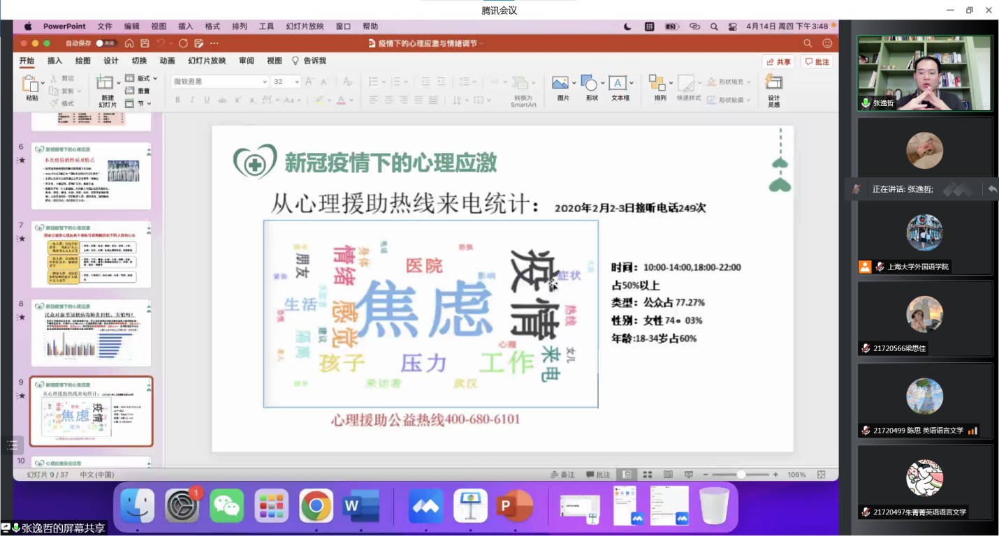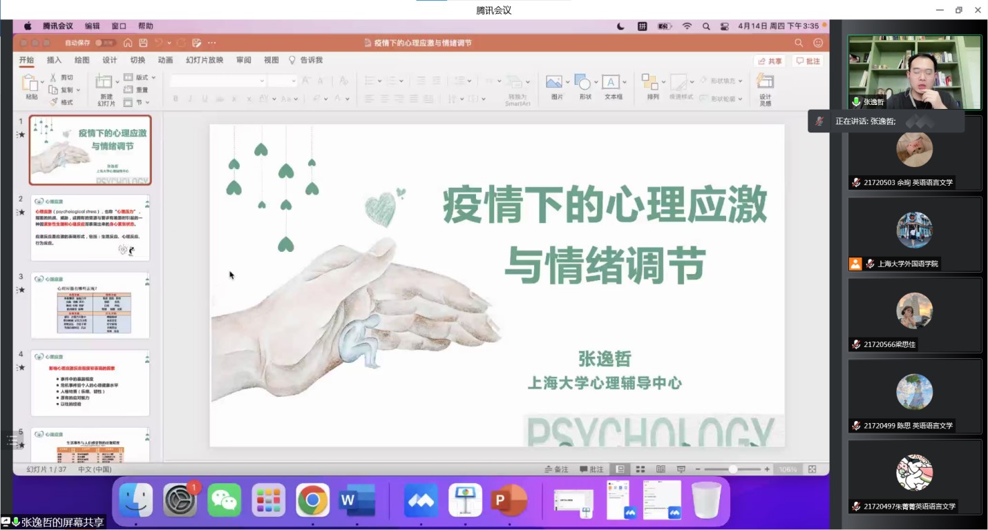 近期,上海疫情防控总体形势仍然十分严峻,公司目前处于封闭管理的特殊时期,公司师生积极参与疫情防范工作中,他们的身影既在志愿服务前线,也在守护后方平安。为帮护广大同学们在特殊时期下保持良好心理状态,由永利集团心理辅导中心主办、3044永利集团承办的“疫情下的心理应激与情绪调节”主题讲座于2022年4月14日下午在云端正式开讲。中国心理学会注册心理师、永利集团心理辅导中心专职心理咨询师张逸哲老师给大家带来了丰富详实、细致暖心的讲座内容,为外院同学们解疑答惑、提供专业而温暖的心理援助。