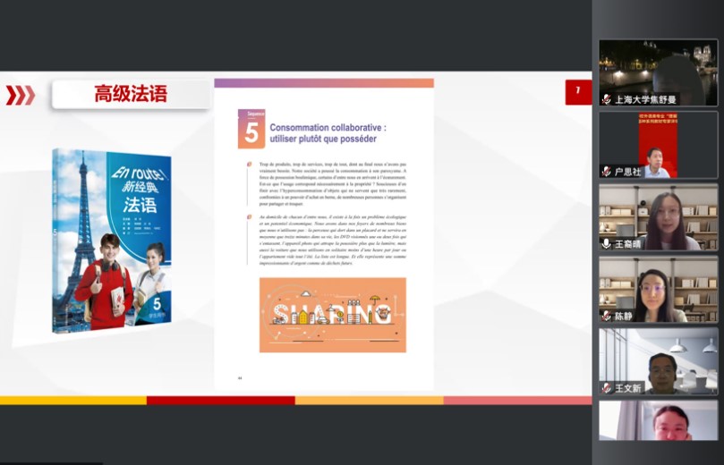 首先王裔晴老师系统介绍了外研社法语教材编辑与出版的最新情况。王文新教授和向维维老师介绍了公司法语学科和专业建设情况。随后在户思社教授的指导下,与会双方就基础法语、法语语音、法国文学、法语国家与地区概况、商务法语等课程以及课程思政的教材建设与选用进行了探讨。