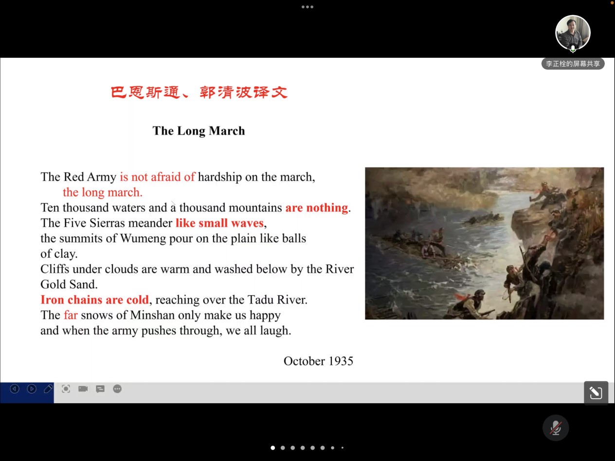 而后,李教授详细介绍了毛泽东诗词翻译与国际传播的四次浪潮和代表性翻译家。自1937年斯诺英译《七律·长征》(The Long March)开始,毛泽东诗词逐渐在西欧、苏联和北美等地流传开来,四次浪潮中的译本数量俱增、波及范围俱广,逐步扩大了毛泽东诗词的国际影响力,匡正了诗人形象和国际形象。李教授依照忠实、通顺、连贯、精准、优美等翻译准则,从韵律、韵脚、遣词、布局、结构等层面切入,对比分析许渊冲、巴恩斯通、郭清波、赵甄陶等翻译家的译本,讲述几位翻译家对宣传毛泽东、中华民族,以及中国共产党和共产党的革命事业的重要意义。期间,李教授肯定了海内外中英文刊物对推动译作传播的巨大作用,并介绍了竹内实、韩素音、聂华苓、保罗·安格尔(Paul Engle)等翻译家做出的重大贡献。
