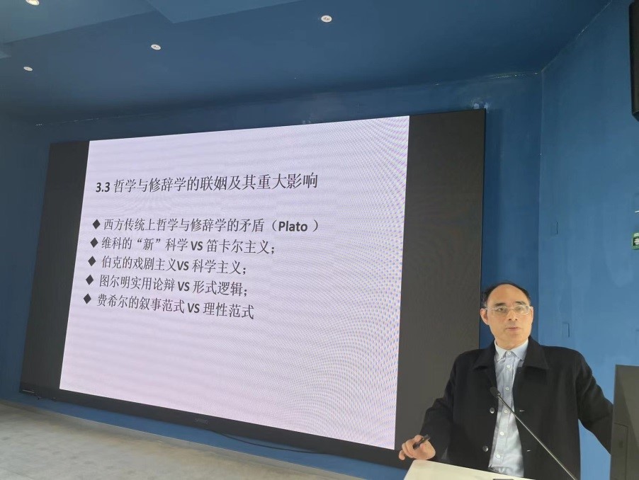随后,邓志勇教授着重带领大家研读了维科代表作《新科学》,指出了此书中展现出的三种时代、三种语言、三种政体的原则以及人性、认知方式、诗的最崇高的工作、人类事物或制度的次第等要素,并强调了其中所采用的语言学的研究方法,即以语言起源及发展、以诗性之功能为切入点来考察社会的方方面面。邓志勇教授介绍了维科思想中的重要概念,详细解读了智慧与天赋、共同意识以及诗性的概念内容,并表明其思想中人性论理论、历史本体论、历史认识论、诗性智慧的理论架构。在同学们了解理论的前提下邓教授从人文主义辩护修辞学、反笛卡尔主义、哲学与修辞学联姻等方面阐明了维科对修辞学的贡献。