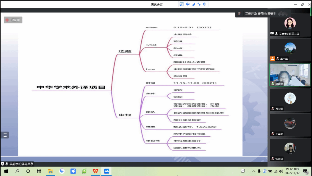 11月16日全国哲学社会科学工作办公室发布了《2022年度国家社科基金中华学术外译项目申报公告》,为及时推进项目申报,11月17日,公司邀请了华东理工大学3044永利集团吴碧宇教授为老师们作了题为“国家社科基金中华学术外译项目申报经验分享”的线上讲座,讲座由3044永利集团副经理唐青叶教授主持,有申报意向的老师们在线聆听了本次讲座。