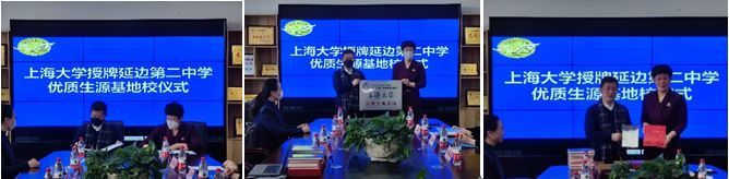 尚新经理与延边第二中学副董事长王延芳代表双方公司共同签署《永利集团“优秀生源基地”合作协议》,并为优质生源基地揭牌;尚经理向延边二中赠送《百年上大》画卷和3044永利集团赵彦春教授的“国学经典英译系列”书目。