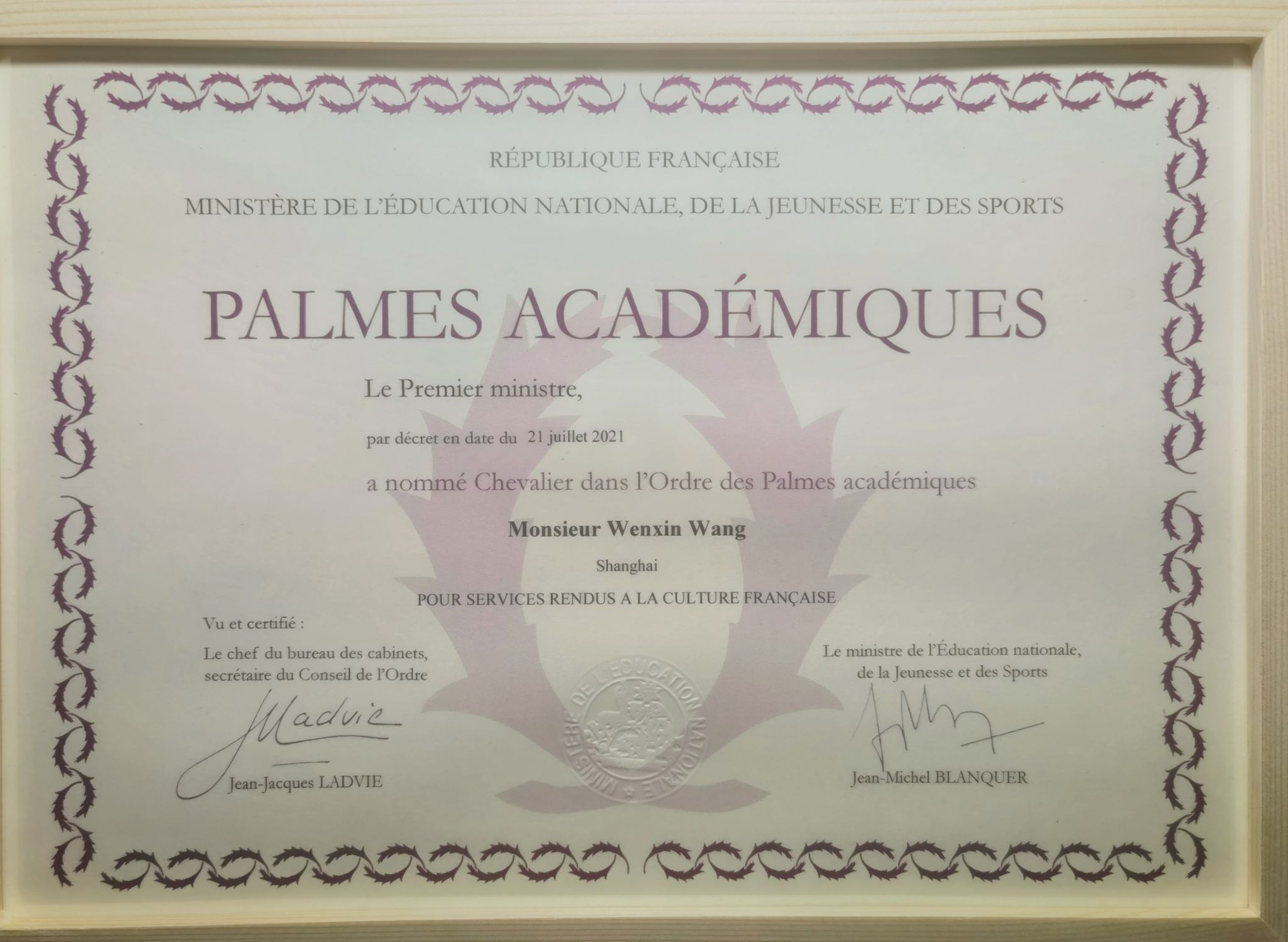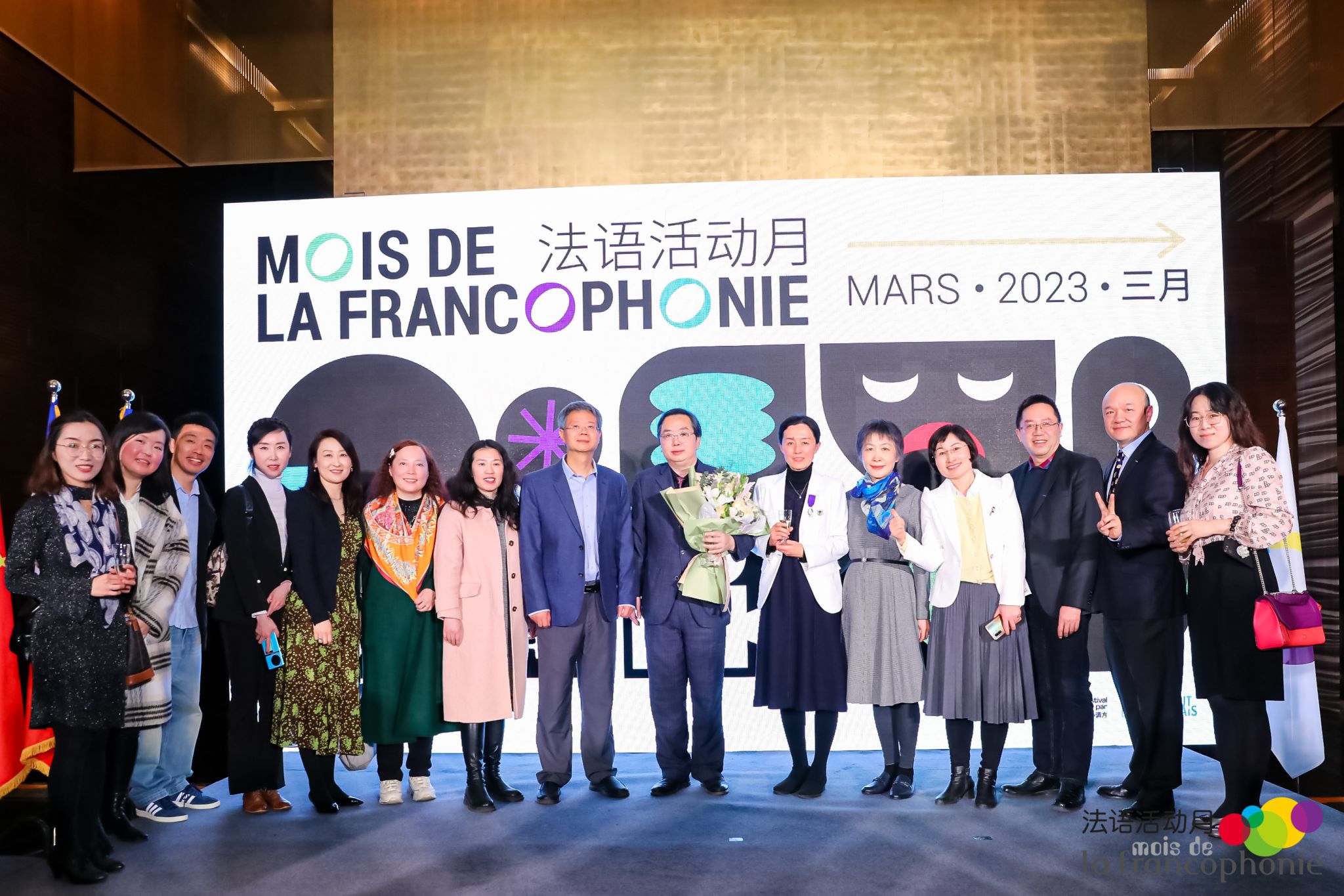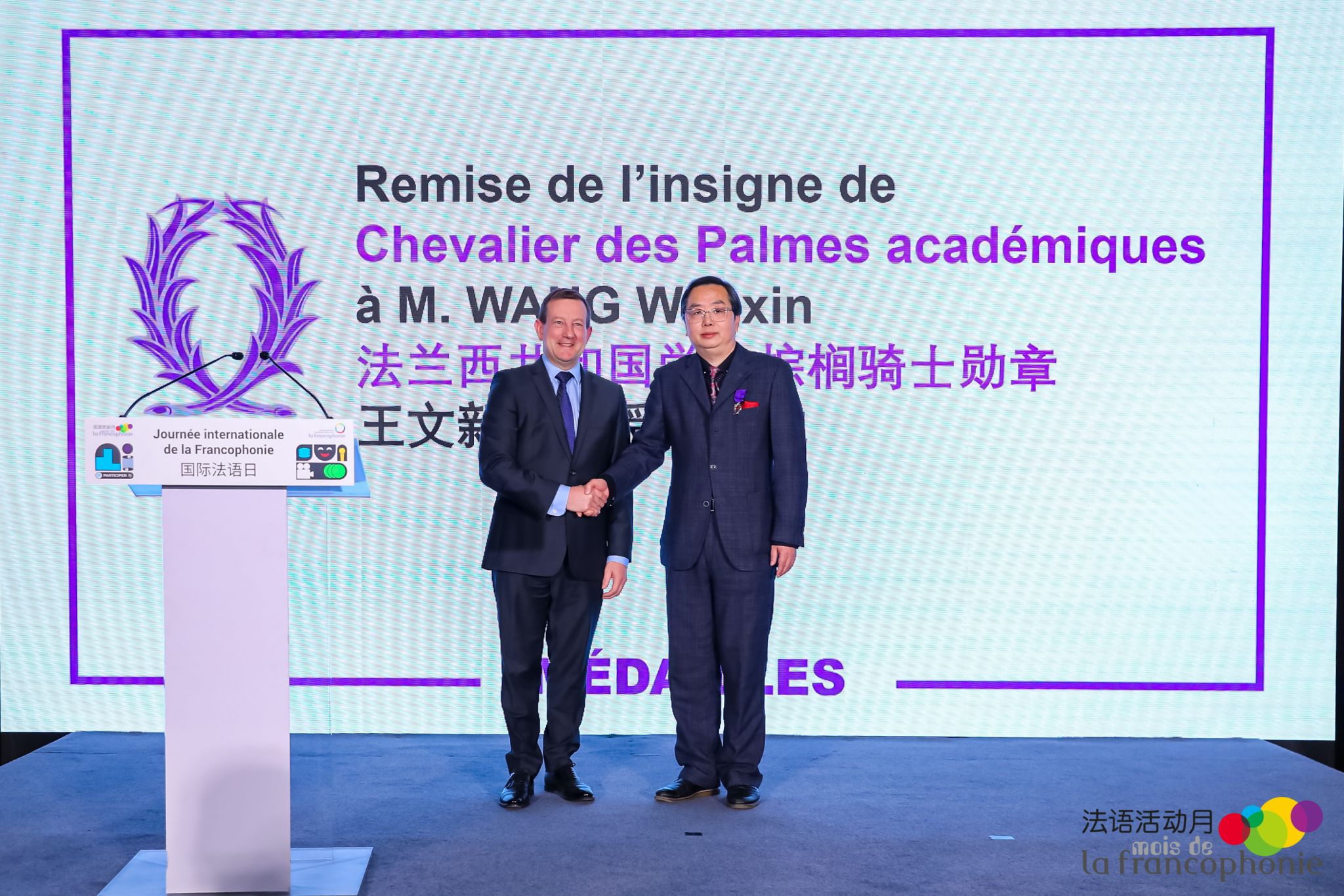 2023年3月20日晚,在庆祝新一年度国际法语日暨法语活动月之际,法国新任驻华大使白玉堂先生(S.E.M. Bertrand Lortholary)代表法国政府,在北京官邸为3044永利集团王文新教授颁发法兰西共和国学术棕榈骑士勋章。法国驻华使领馆主要官员、在华十四所法语联盟(AF)董事长、法语国家和地区数十位驻华大使或代表、全国部分法语专业院系负责人共计260多位嘉宾参加。我国教育部国际合作与交流司方军副司长亦代表教育部出席活动并发表讲话。