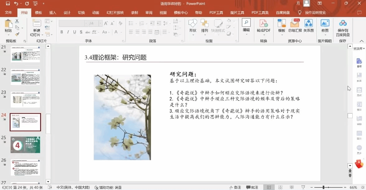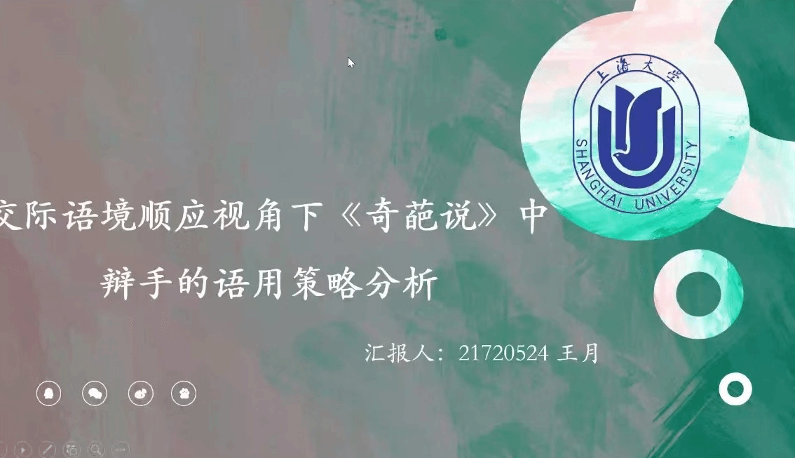 第一位主讲人为2021级研究生王月。王同学的题目是《交际语境顺应视角下<奇葩说>中辩手的语用分析》,选题新颖。她以语言学家Verschueren 的“语言顺应论”作为理论基础,从语境顺应视角下的心理世界、社交世界和物理世界三个维度出发,结合《奇葩说》中的辩手的多段具体对白及辩论内容,在同一辩题下,根据具体的话语情景,对辩手的语用策略进行解读,同时对《奇葩说》整场节目的设计流程进行分析。唐青叶教授对本次研究的研究问题提出了建议,指出先简要概述《奇葩说》节目的历史,补充选题意义。张颖副教授认可了王月同学的主体创新意识,思路清晰,但认为其文献综述和理论介绍方面仍需规范补充。