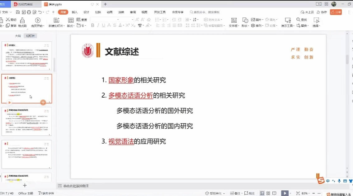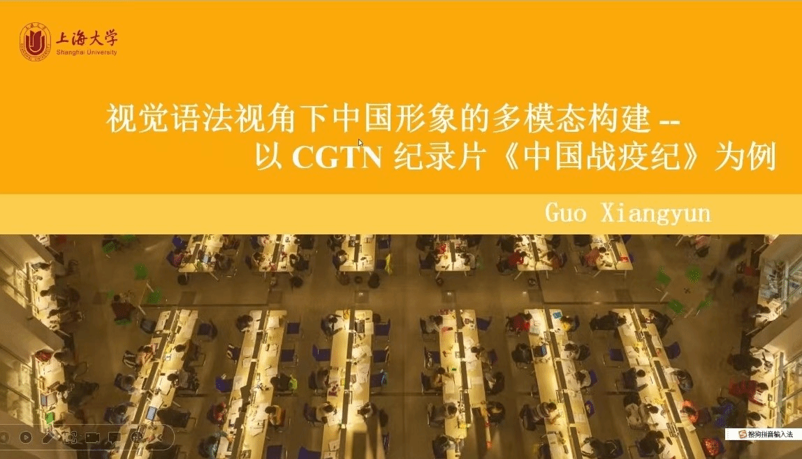 第三位主讲人为2022级研究生郭祥云。郭同学的题目是《视觉语法视角下中国形象的多模态构建——以 CGTN 纪录片<中国战疫纪>为例》,她选取 CGTN 推出的记录片《中国战疫纪》作为语料,以Kress & Van Leeuwen视觉语法理论为基础,以多模态话语分析作为分析路径,分别探讨宏观层面该纪录片的再现意义、互动意义和构图意义的动态构建过程,探寻官方媒体在新冠疫情这一重大公共卫生事件背景下如何通过纪录片这一话语实践进行国家形象的构建。唐青叶教授建议补充中国形象研究的文献综述,并进行评述,指出现有研究的问题和不足,增强研究深度。张新玲教授提出要注重区分视觉语法和普通语法的区别,明确语料选取的原则,量化方法需更严谨。