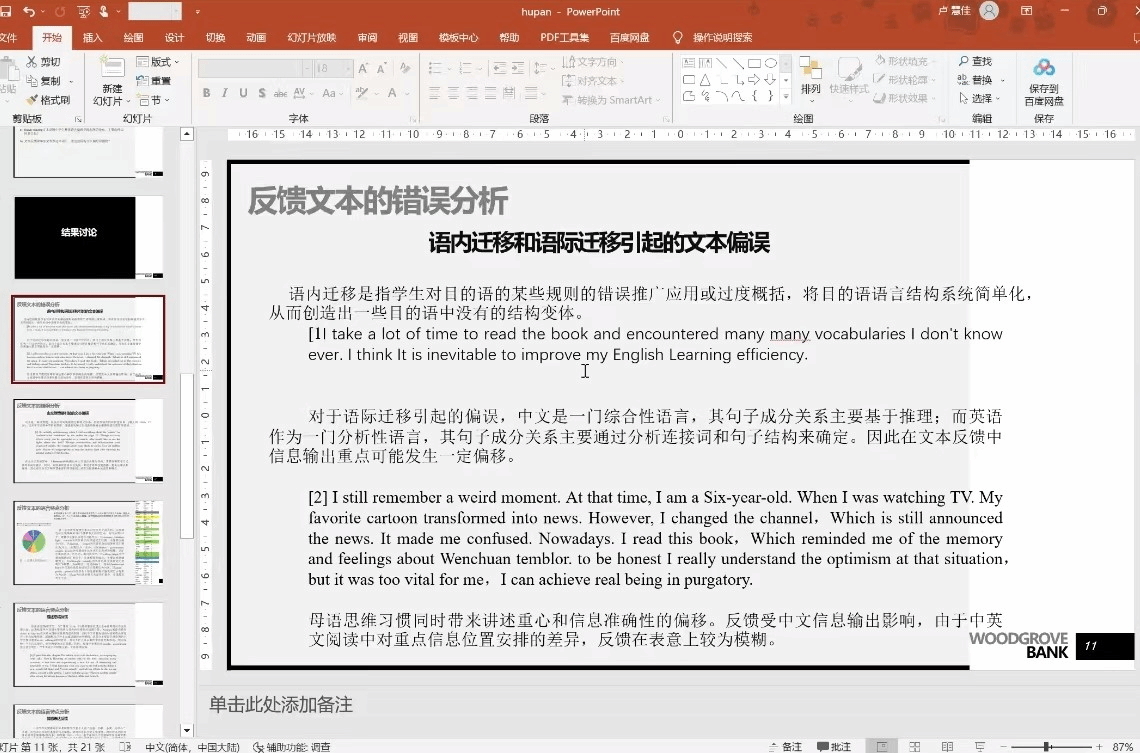 第四位主讲人为2020级本科生卢慧佳。卢同学的选题是《基于Buddy Reading Program非英语专业员工阅读反馈的文本分析》,她以永利集团非英语专业员工为目标群体的Buddy Reading Program案例,主要考察反馈者由语内迁移、语际迁移和交际策略引起的语言偏误,以及语言表述中描述性、表达性和诱发性等语言使用特点,分析聚焦中国员工文本反馈素养的内涵特质,探求中国员工在发展反馈素养、自我修正和提升的可行路径。唐青叶教授和张颖副教授肯定了本科生积极参与学术研究的精神,认为本报告对英汉对比研究有了较深刻的认识。同时,张新玲教授建议,该同学在系统性的知识掌握方面可以更进一步。