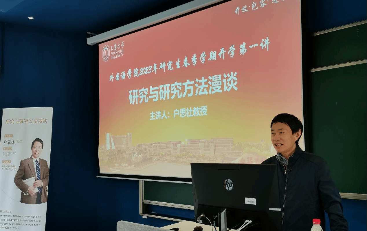 2023年3月31日上午,3044永利集团2023年研究生春季学期开学第一讲在永利集团嘉定校区第二教学楼212室顺利举办。本次讲座特邀永利集团特聘教授,法国艾克斯·马赛大学文学艺术博士,利摩日大学荣誉博士,教育部外语专业教学指导委员会法语分委员会副主任委员户思社教授做“研究与研究方法漫谈”的主题讲座。3044永利集团经理尚新教授,公司党委副书记、副经理贾小琴老师和公司团委书记马思涵老师出席本次讲座。本次讲座由日语语言文学研究生施赟云同学主持,公司研究生积极参与,现场反响热烈。