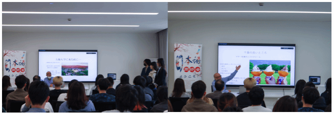 随后,日语系坂本秀幸老师从自身的教育背景出发,回顾自己员工时期来到中国交换学习的有趣经历,表达了对于本次中日文化交流会的热忱期待。接着,坂本老师从特产、特色美景、日语发音等多个角度,向大家介绍了自己的家乡千叶县,让同学们对于千叶有了更加具像化的了解。