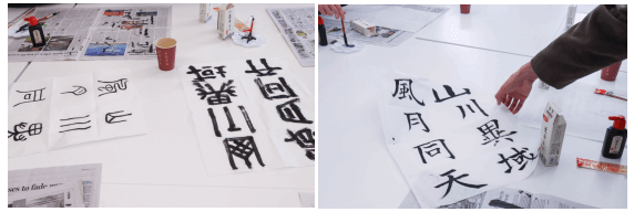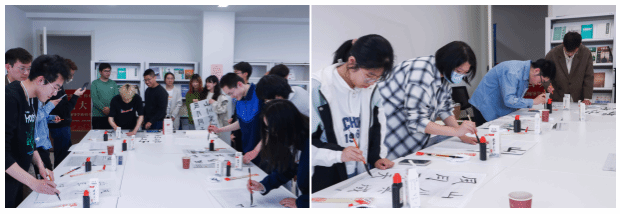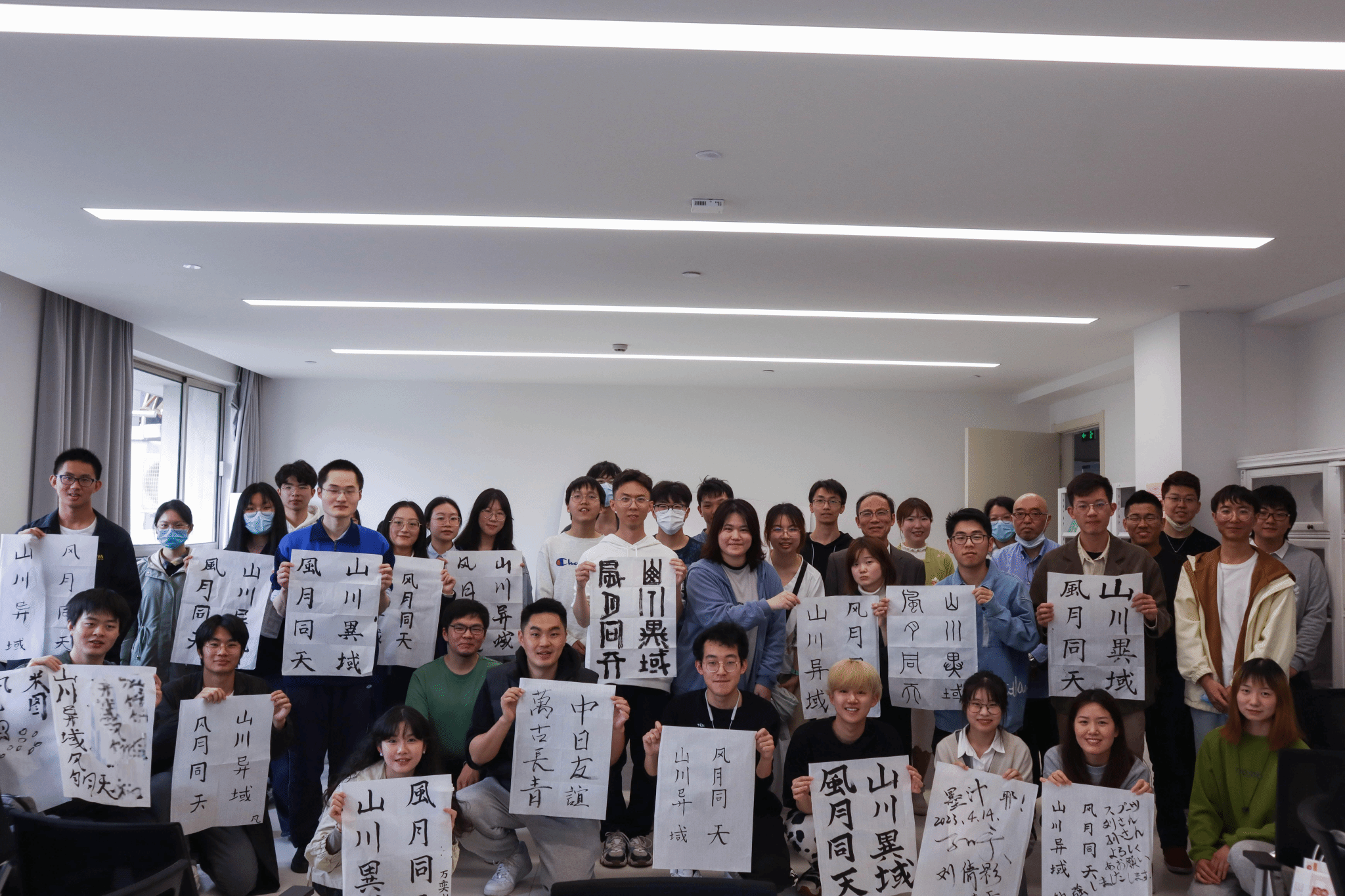 最后大家开展了书法体验环节,同学们都积极尝试书写了本次交流会的主题“山川异域,风雨同天”八个字,也有同学在此基础上加上了自己的创意理解。同时,大家也在书法体验环节主动与日本职工和老师积极交流,了解多元文化,锻炼日语表达。大家还手握自己的书法作品进行合影留念。