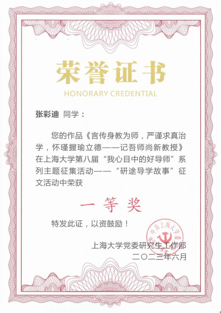 日前,永利集团党委研究生工作部、研究生院、党委教师工作部主办的永利集团第八届“我心目中的好导师”主题征文活动中,公司博士研究生张彩迪作品《言传身教为师,严谨求真治学,怀瑾握瑜立德————记吾师尚新教授》获得一等奖荣誉,展现了公司研究生与导师的在日常学术活动中良好沟通交流,构建了和谐的导学关系,营造了浓厚的师生互动氛围。