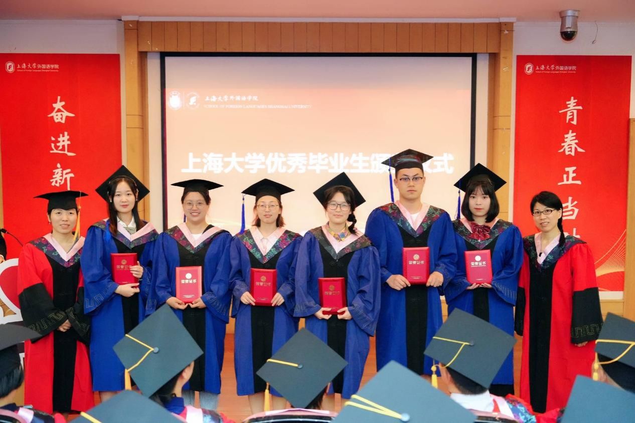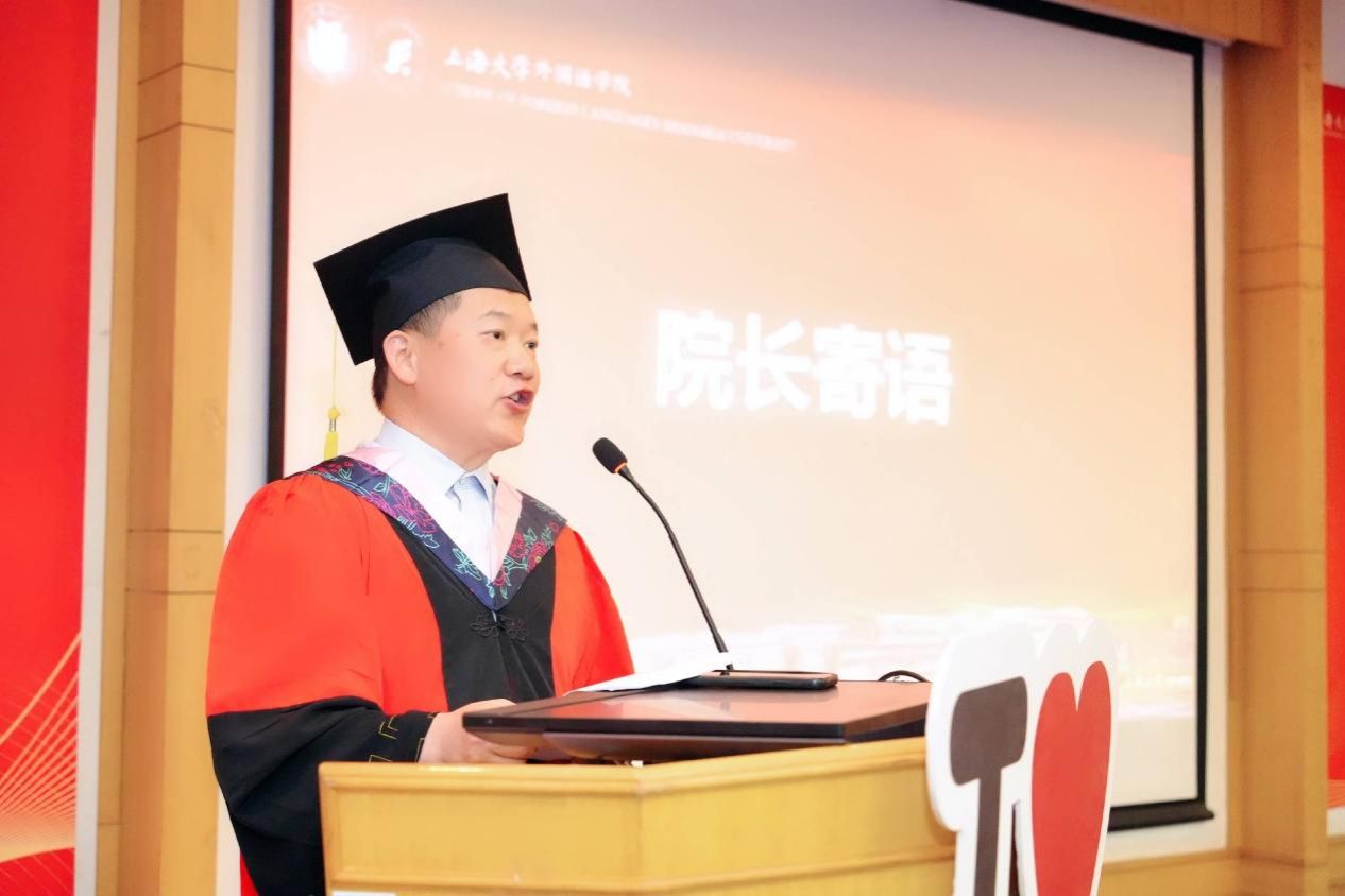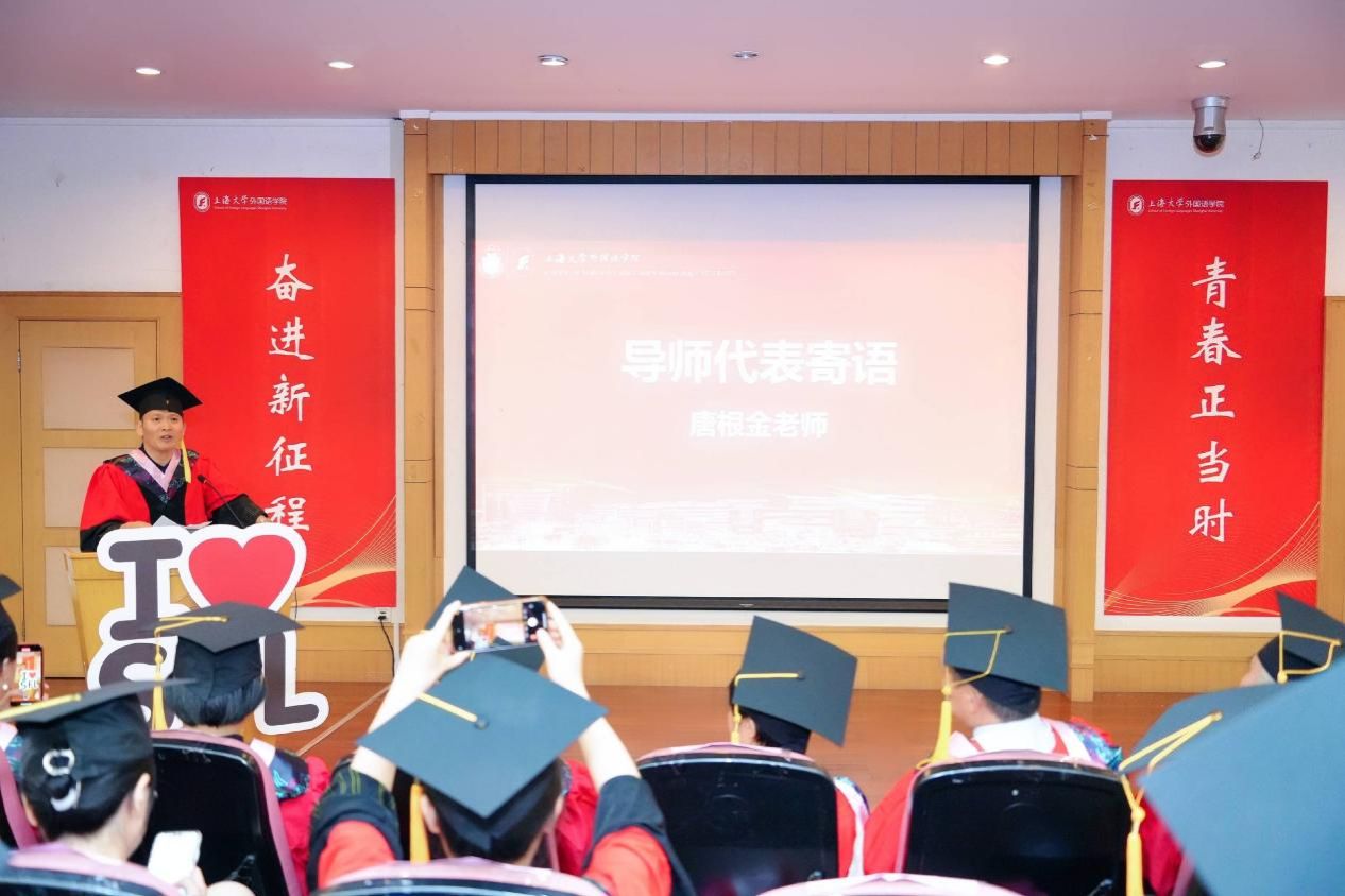 接着,优秀毕业生代表曹怡雯(本科生)、沈露怡(研究生)、贺靓(博士生)依次上台发言,向大家分享自己对大学学习生活实践的感悟,以及对母校的祝福。曹怡雯同学回顾了在母校四年的成长与收获,表达了身为上大外院人的骄傲,并呼吁毕业生们直面挑战与挫折,坚定地走向明天,迎接每一天的曙光。