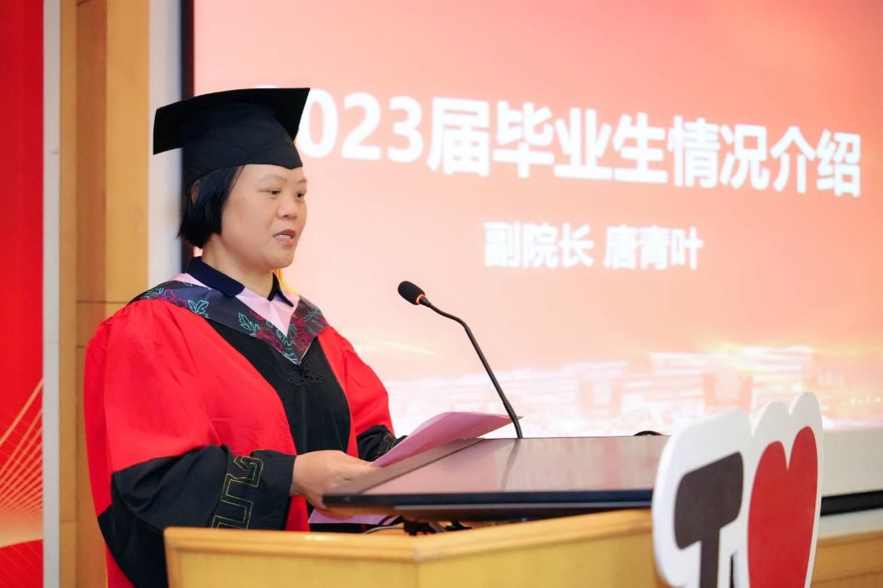 随后,公司副经理唐青叶教授介绍了2023届毕业生整体情况、所获荣誉及毕业去向。唐经理对毕业生们顺利完成学业表示祝贺,也对同学们在各个领域中取得的成绩表示肯定,为他们所取得的成绩感到骄傲自豪,同时也希望大家能够在新的人生篇章中再创佳绩。