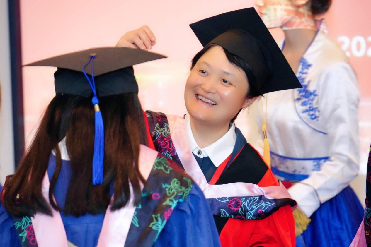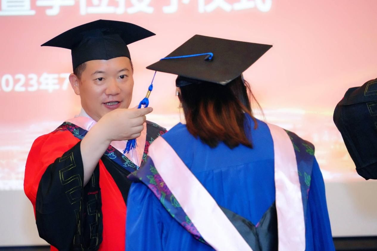 随着激昂的音乐声响起,典礼迎来了最激动人心的学位颁授环节。本环节由公司党委副书记、副经理贾小琴主持,公司党委书记吴蔚老师,党委副书记、经理尚新老师,副经理戴朝晖、唐青叶、阚怀未老师,为各位毕业生颁发学位证书、贺信并拨穗,帽穗从右拨向左边,代表着毕业生们学业的完成,代表着一段奋斗时光的圆满结束,也代表着新征程的开始。