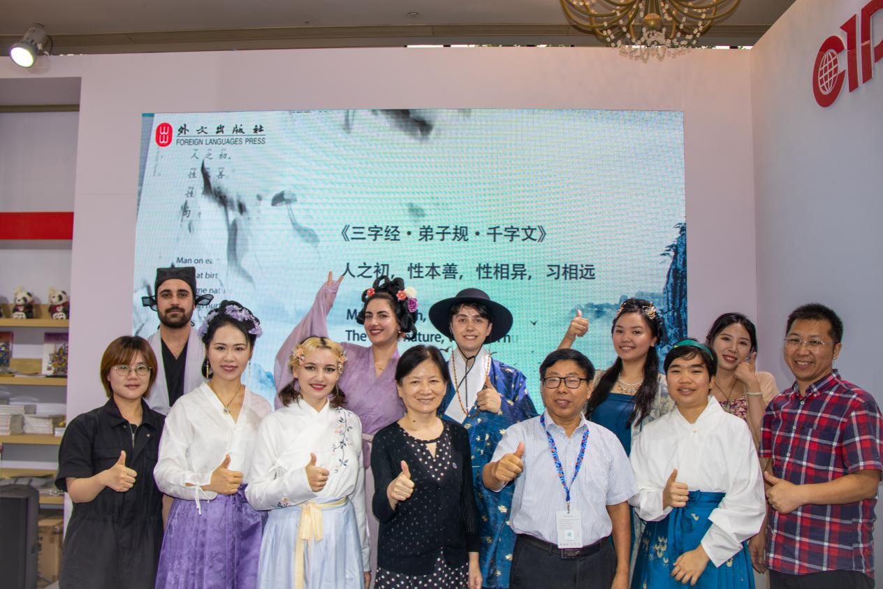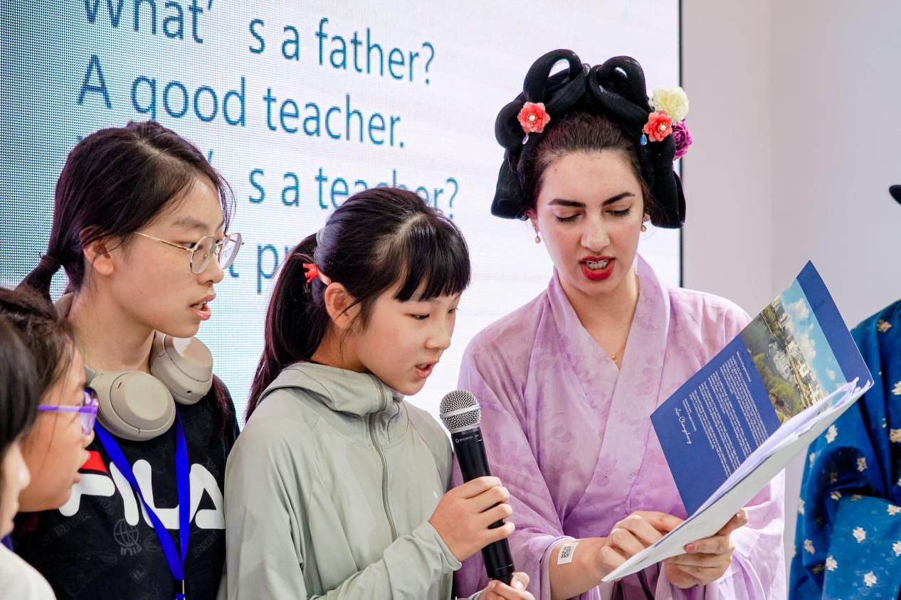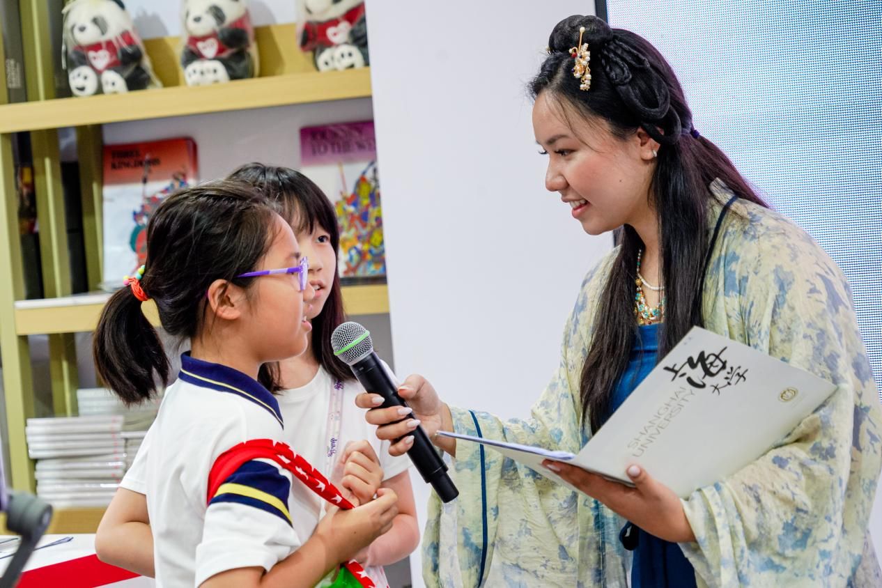 随后,永利集团职工萨娜(伊朗)、奥坎(土耳其)、刘秀春(泰国)、米莱(乌兹别克斯坦)、维瑞(俄罗斯)、王琛(美国/法国)身着汉服为观众带来了一场别样的《三字经》中英文双语朗诵。琅琅书声吸引了逛展观众纷纷驻足停留,简洁明了、合辙押韵的译文也让观众们感受到了中国经典被翻译后的美感。在浓厚的国学氛围中,职工们与观众进行了现场互动,知识问答和《三字经》词语填空环节点燃了大小观众的参与热情。最后,职工带领现场小观众进行《三字经》英文朗诵,让小朋友充分体验了英韵《三字经》的魅力。