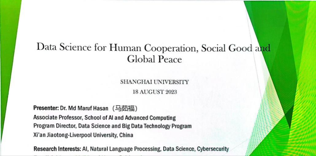 会议下半段,Maruf Hasanz主任做了题为“Data Science for Human Cooperation,Social Good and Global Peace”的发言,介绍了其正在执行的项目内容、目标和挑战等,重点强调了数据科学服务人类发展的理念以及科研合作的必要性。对此,唐青叶副经理表示高度赞同,并就项目之间的契合点和共通点做了进一步说明。