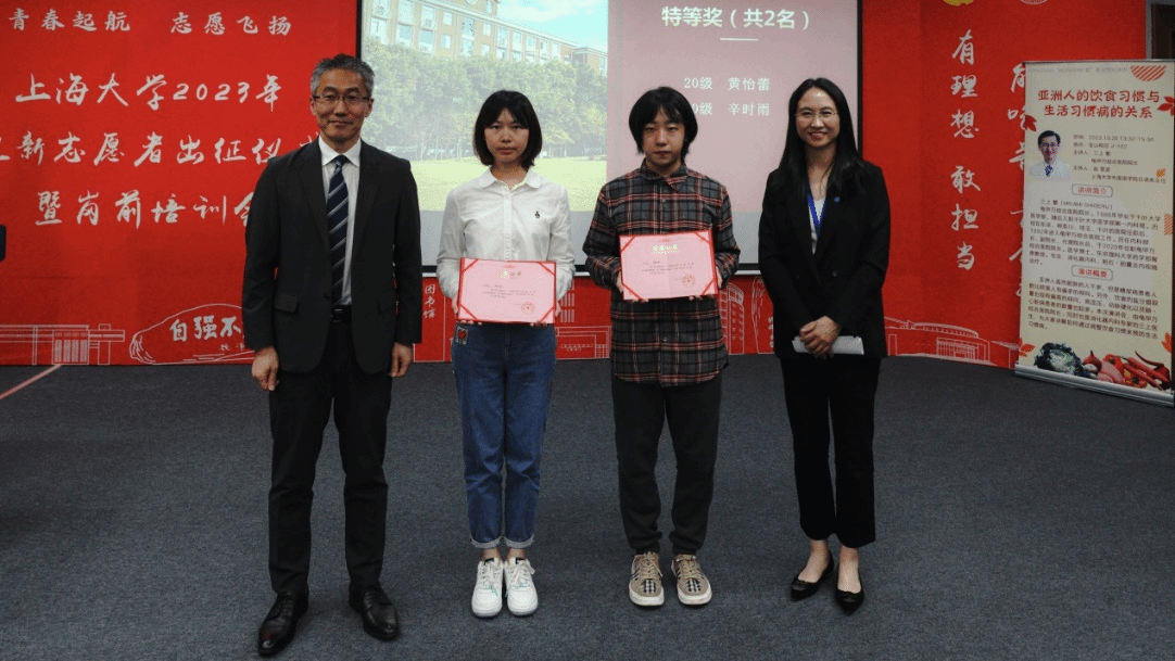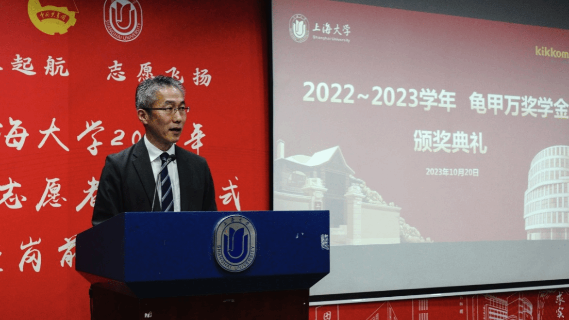 10月20日下午,拥有350多年历史的世界知名日本调味品品牌龟甲万公司海外管理部部长梅本洋先生一行访问公司。龟甲万公司旗下的龟甲万综合医院经理三上繁在宝山校区J102为日语系师生做了题为“亚洲人的饮食习惯与生活习惯病的关系”的专题演讲。演讲后,举行了2022-2023学年KIKKOMAN“紫 MURASAKI”奖学金颁奖仪式。上海市对外友协郭盛麟处长,龟甲万海外管理部部长梅本洋先生,海外管理部项目负责人大泽 绫女士,公司党委书记吴蔚,党委副书记、副经理贾小琴,日语系主任赵莹波和近百名日语系师生参加了讲座和颁奖仪式,本次活动由日语系廖瑞平老师中、日双语主持。