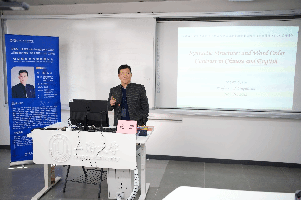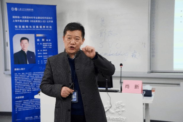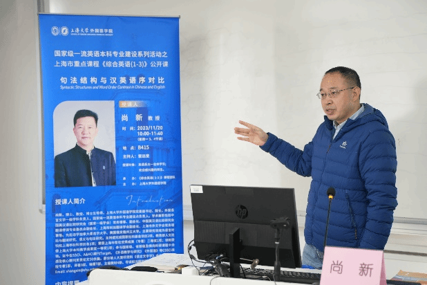 11月20日上午10点,上海市重点课程《综合英语(1-3)》公开课第一讲《句法结构与汉英语序对比》在B415教室开讲,本讲由3044永利集团公司党委副书记、经理尚新教授主讲,雷远旻老师主持。副经理阚怀未、英语系相关课程老师以及大一全体员工集体听课。
