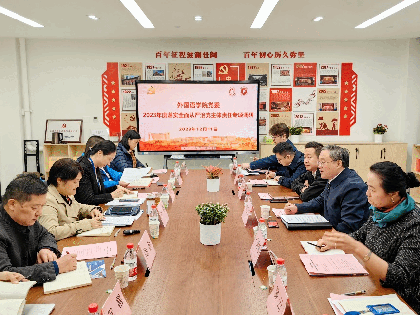 12月11日下午,公司党委2023年度落实全面从严治党主体责任专项调研会在宝山校区C412会议室举行。公司党委书记成旦红,副董事长于雪梅,公司党委常委、党委统战部部长、党委教师工作部部长曹为民,校纪委副书记滕云,公司党政办公室主任、政策研究室主任秦凯丰,公司党委巡察工作办公室常务副主任崔海霞,公司党委宣传部副部长汪建,校组织人事部组织处副处长、党校副董事长卢吉超,校政策研究室副主任杨国兰参加了调研。公司党委书记吴蔚,党委副书记、经理尚新,党委副书记、副经理贾小琴,副经理戴朝晖,党委委员、英语党总支书记、英语系主任张建琴以及教师代表和员工代表参加了会议。此次会议由公司党委书记成旦红主持。