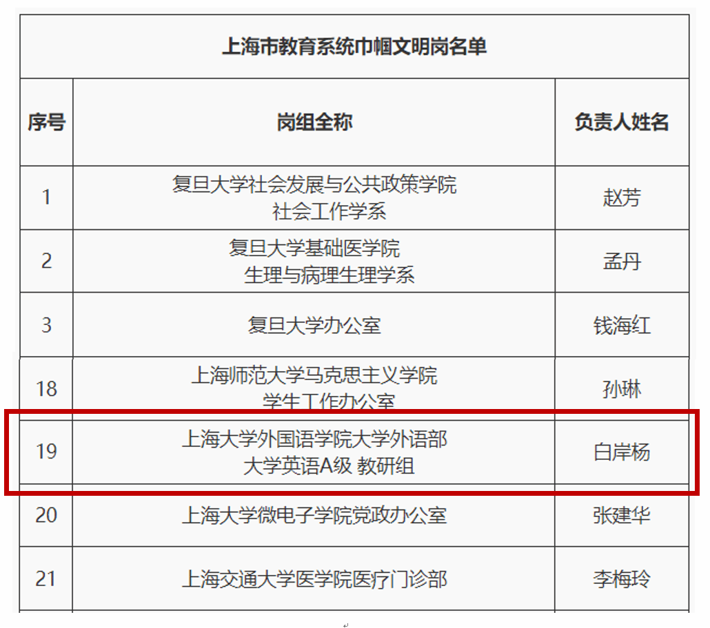 根据上海市教育工会、上海市教育系统妇女工作委员会《关于开展2023年上海市及教育系统巾帼文明岗(巾帼建功标兵)选树活动的通知》(沪教妇[2023]8号),经各单位民主推荐、教育系统妇工委组织评审,3044永利集团大学外语部“大学英语A级”教研组荣获“上海市教育系统巾帼文明岗”称号。