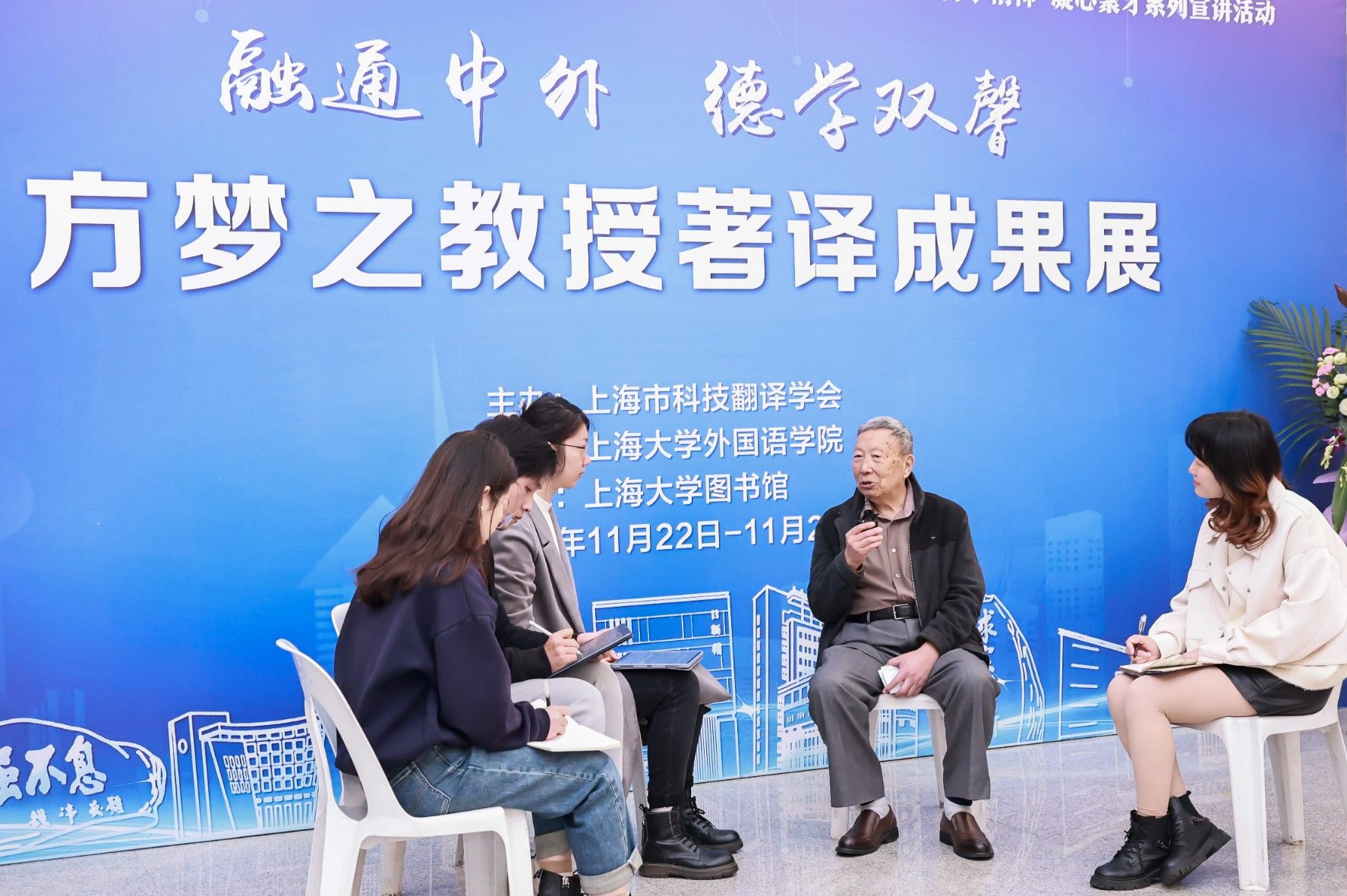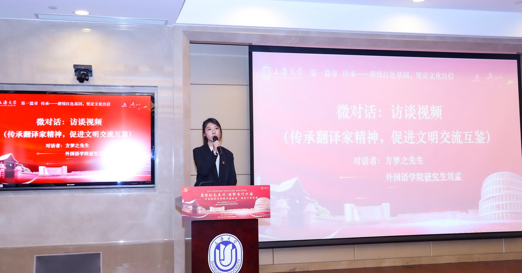 第一篇章“传承——赓续红色基因,坚定文化自信”,以视频《山河岁月》中的片段拉开序幕,讲述了以李达、陈望道等为代表的马克思主义经典著作翻译家群体的故事,他们用信仰的星星之火点亮了一代人心中的革命理想。3044永利集团研究生刘孟与公司荣休教授、《上海翻译》名誉主编方梦之先生的对话则生动展现了新时代中国翻译人的担当与职责使命。方梦之教授创建的应用翻译理论框架开启了应用翻译学科体系研究之先河,他鼓励同学们要将思与学结合,在学中思考,要从基础做起,积极投身翻译实践,在实践中打好基础。刘孟同学表示,作为青年一代,应该继续传承发扬翻译家科学精神,促进文明交流与互鉴,为世界翻译学的进步贡献自己的力量!