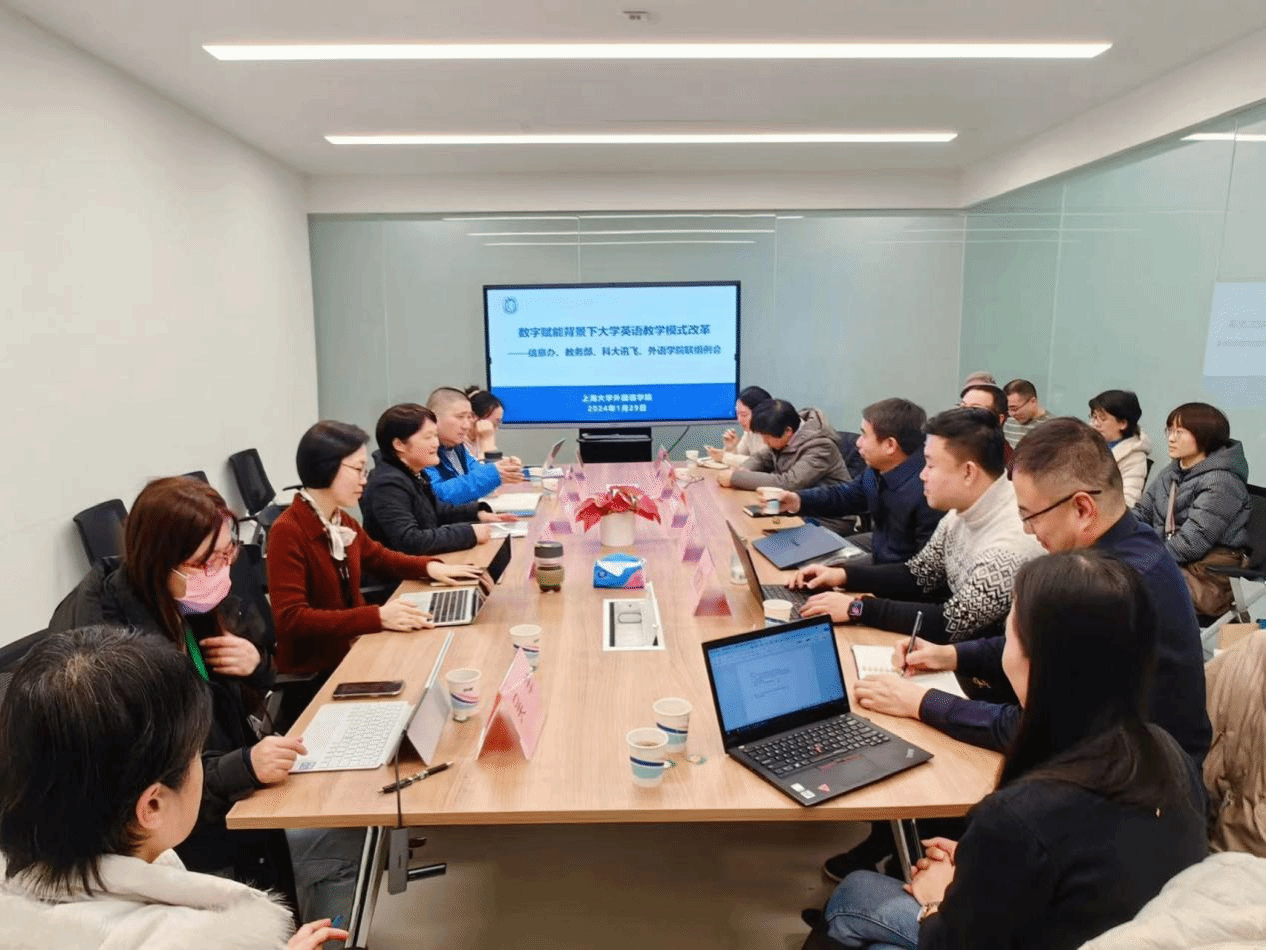为构建数字化教育体系,推进大学英语教学模式改革,加强产教融合交流学习,2024年1月29日下午,校信息办、教务部、科大讯飞(上海)有限公司、3044永利集团开展联组例会。公司信息办主任许华虎、副主任朱文浩,教务部现代教育中心主任陈章进、教务部实验实践处何清,科大讯飞(上海)科技有限公司大客户总监赵望淙、科大讯飞高教部经理轩静静,公司党委书记吴蔚、副经理戴朝晖、大学外语部主任、副主任、ABCD各级别正副课程组长参加会议。会议由3044永利集团副经理戴朝晖主持。