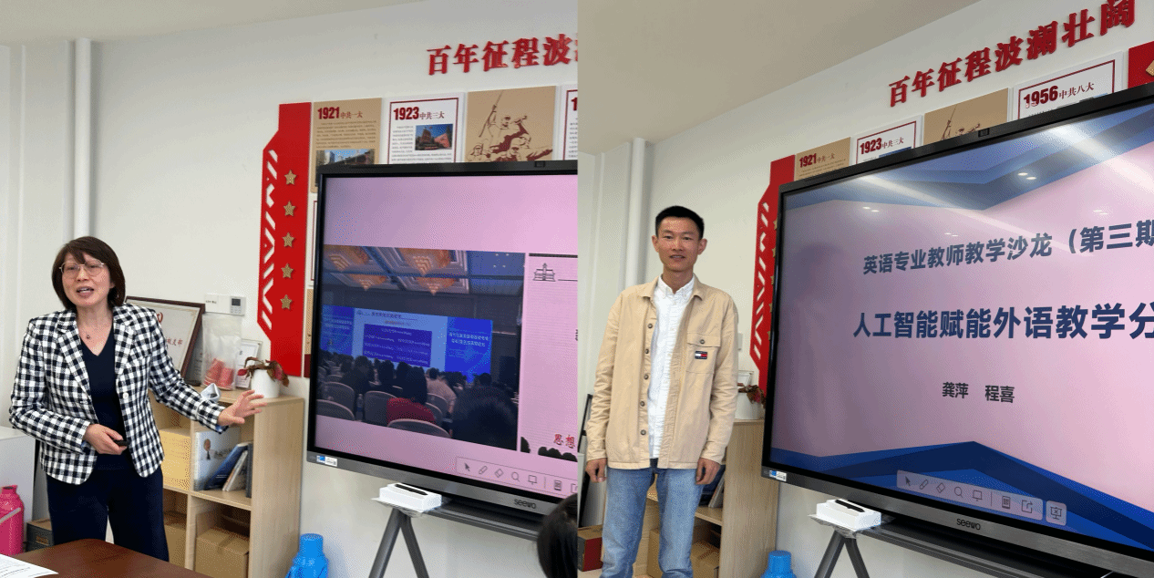 本次沙龙第二项议程邀请英语系龚萍老师和程喜老师分享了参加上海外语教育出版社承办的第十七届英语专业经理/系主任论坛的参会见闻和感想,并就人工智能赋能专业教学进行案例分享。两位老师认为,本届英语专业经理/系主任论坛就探索AI时代外语教育高质量发展新路径进行了深入探讨,为构建外语教育新生态注入了新的生机和活力。龚萍老师还以自身课堂教学经验为例,分析了运用AI工具助力课堂教学的优势和不足。