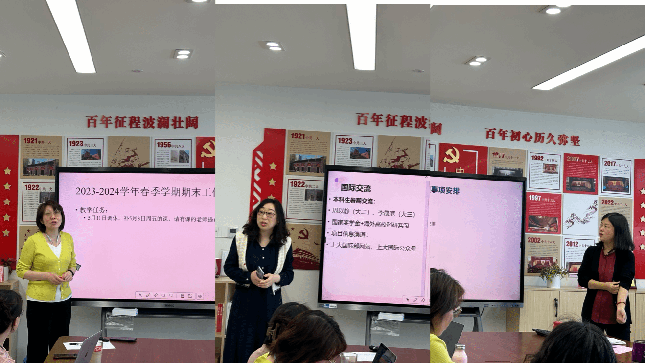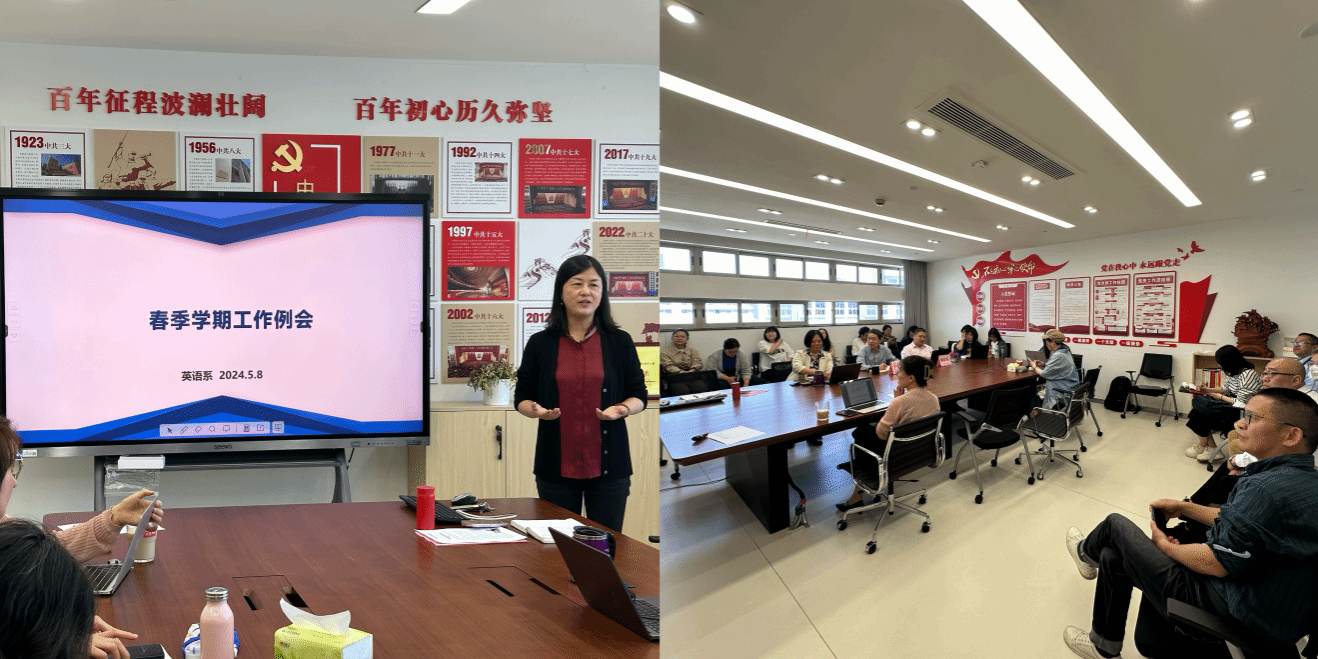 首先,英语系开展工作例会。英语系副主任龚萍老师首先介绍了2023-2024学年春季学期期末的工作要点,提示任课教师做好期末考试准备工作,严守考试纪律。此外,龚老师介绍了2024-2025学年秋季学期的教学任务和班级设置原则。最后,龚老师详细说明了2024届毕业论文工作要点,提示论文指导教师细致做好后续论文呢评阅和答辩工作。接着,英语系副主任张珊珊老师就其负责的国际交流工作做了详细汇报。张老师介绍了英语系本科生暑期交流项目申报情况,提醒老师们多多关注相关项目的申报信息,鼓励员工们积极申报,借此机会拓展她们的国际视野。随后,张建琴主任就英语系招生及管理事项安排做了具体介绍,包括2023-2024学年招生规模、AI+课程工作安排、教师培训安排、2024级培养方案修订等。张老师指出,随着教育技术的不断发展,英语系需要紧跟时代步伐,不断更新教学内容和方式,以培养出具备国际视野和竞争力的优秀外语人才。